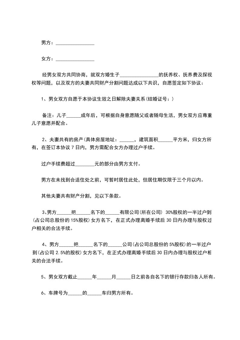 经男女双方共同协商,就双方婚生子________________的抚养权、抚养费及探视权等问题,以及双方的夫妻共同财产分割问题达成以下共识,自愿签定如下协议: