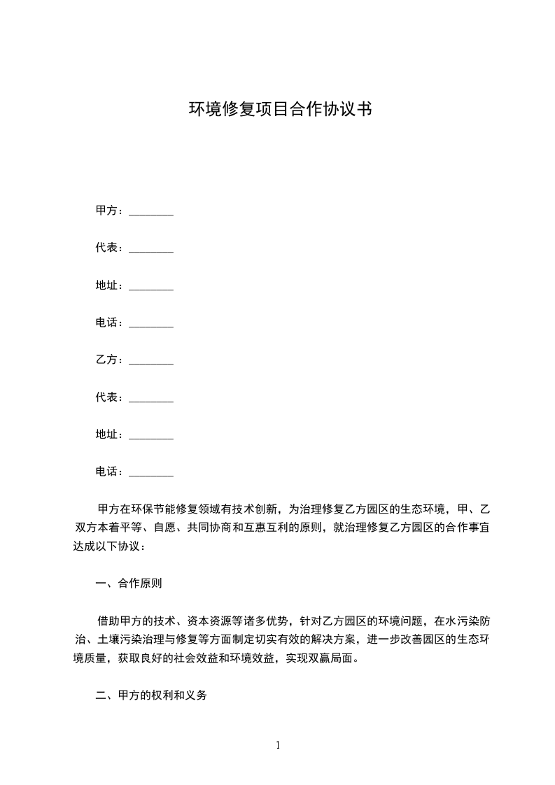 甲方在环保节能修复领域有技术创新,为治理修复乙方园区的生态环境,甲、乙双方本着平等、自愿、共同协商和互惠互利的原则,就治理修复乙方园区的合作事宜达成以下协议: