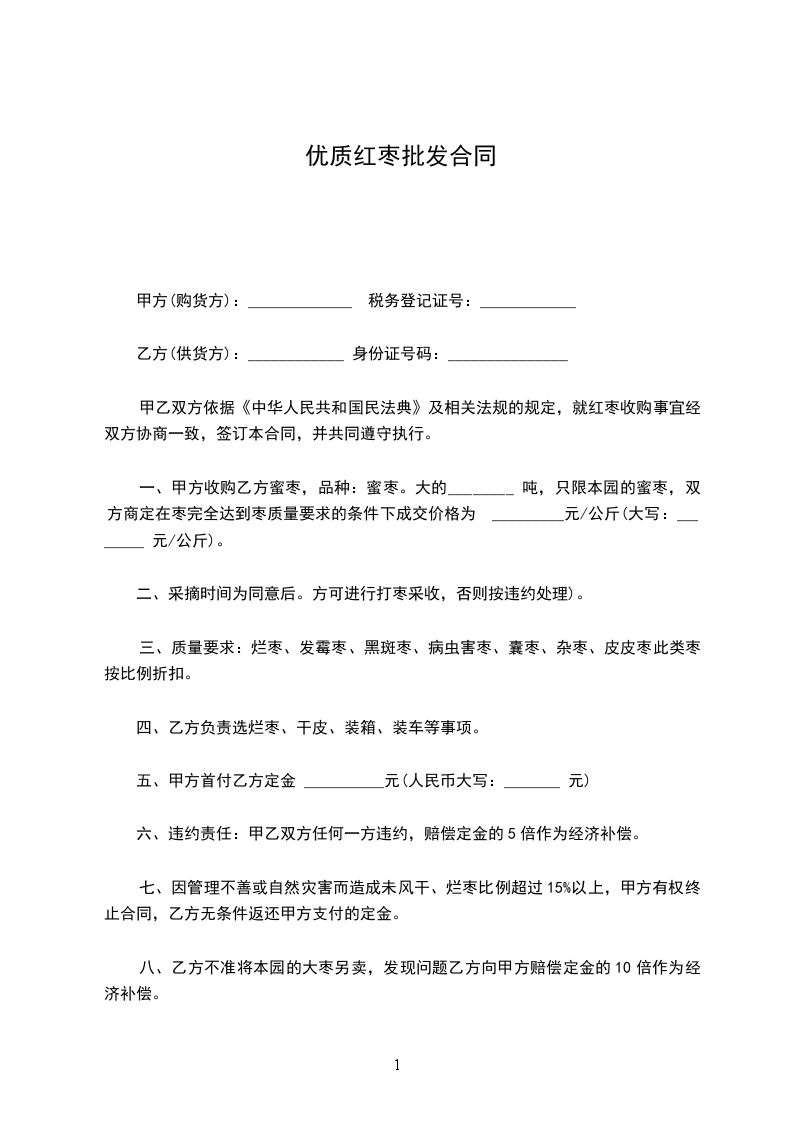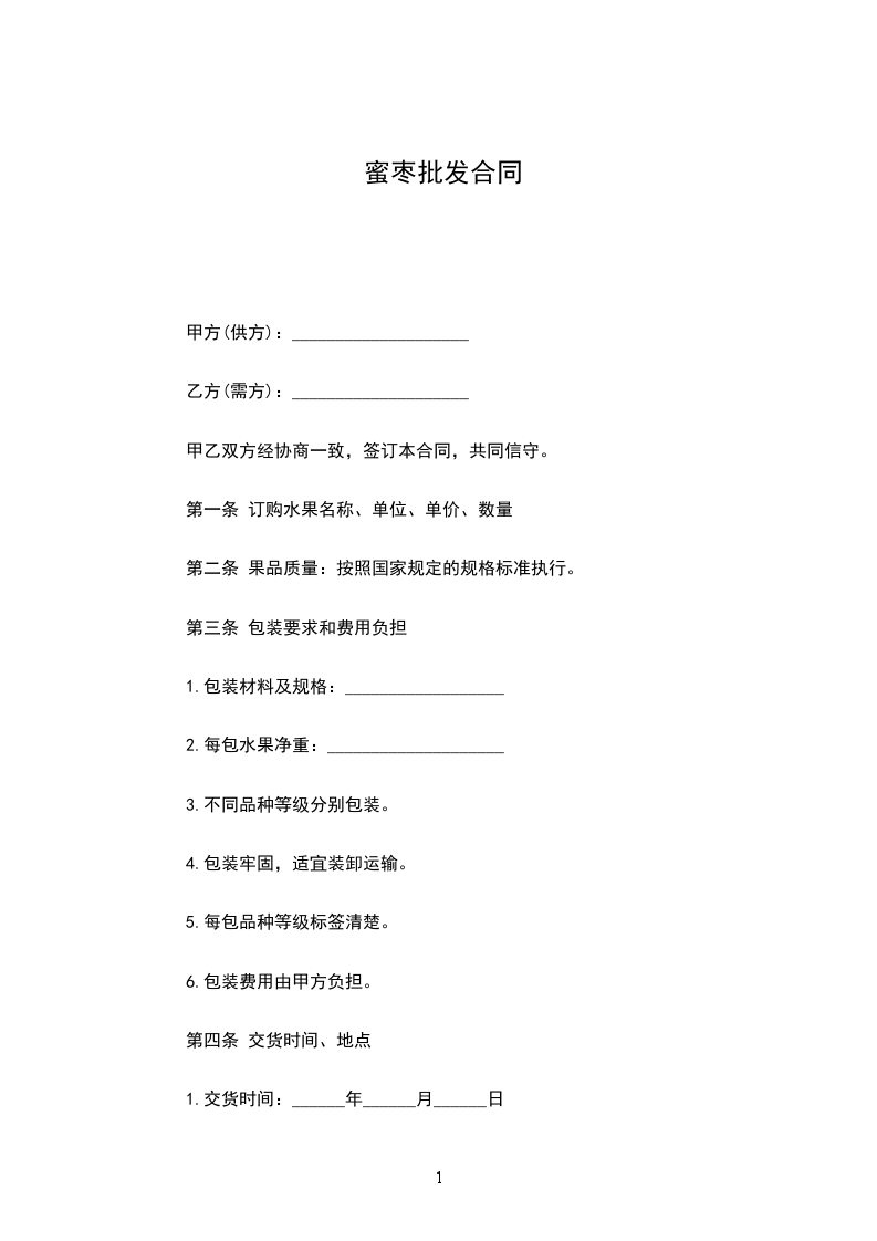 一、甲方收购乙方蜜枣,品种:蜜枣。大的________ 吨,只限本园的蜜枣,双方商定在枣完全达到枣质量要求的条件下成交价格为 _________元/公斤(大写:________ 元/公斤)。