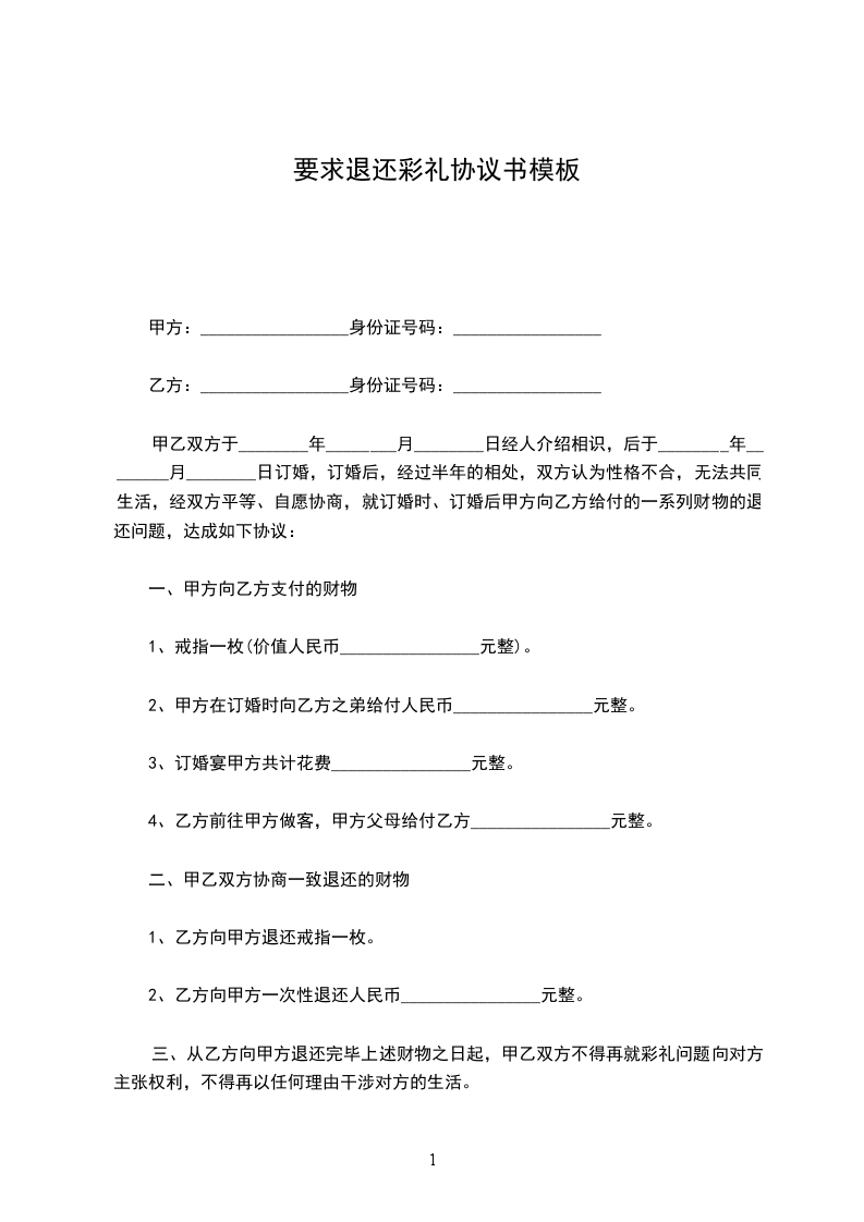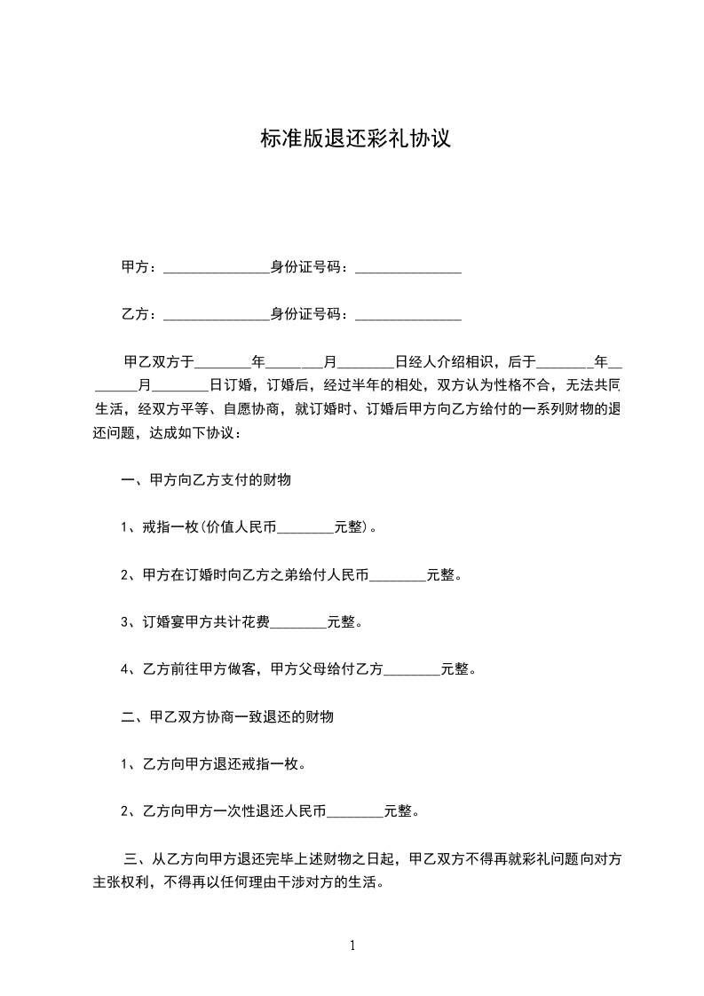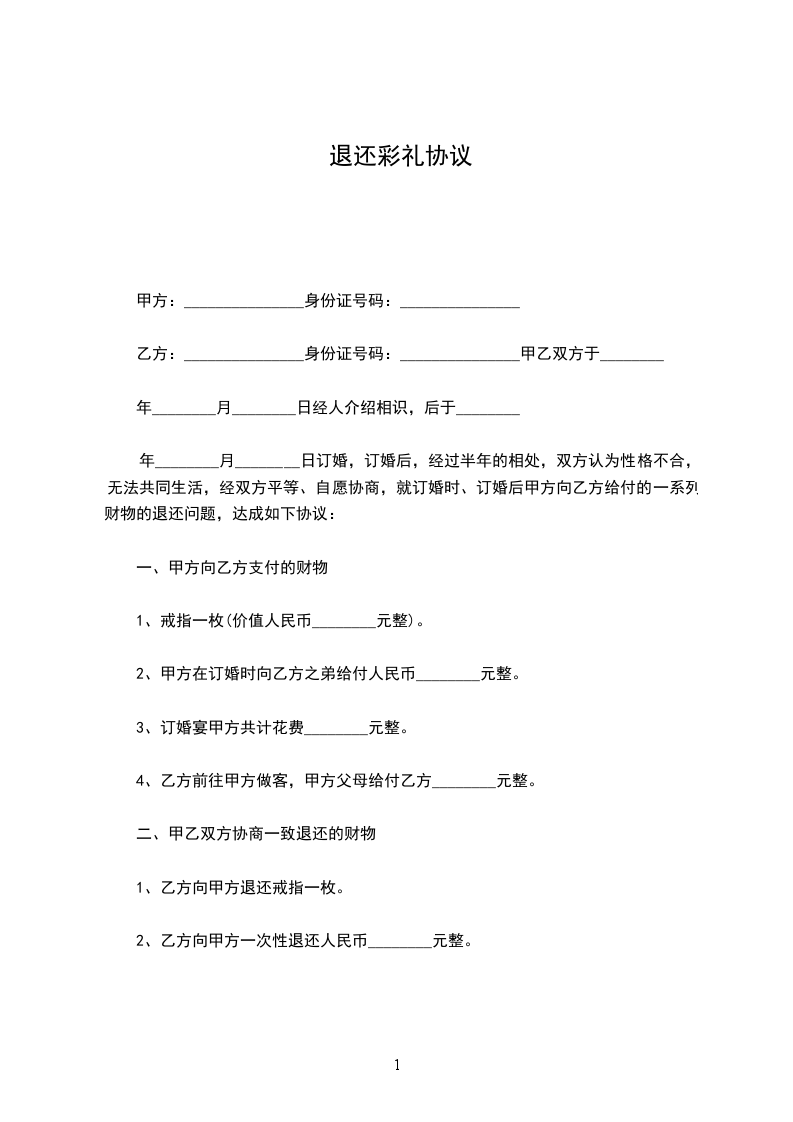 1. 乙方同意按照以下方式向甲方退还彩礼: