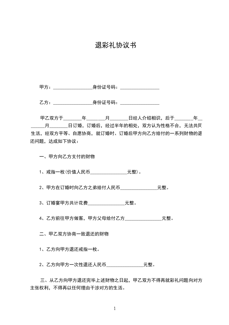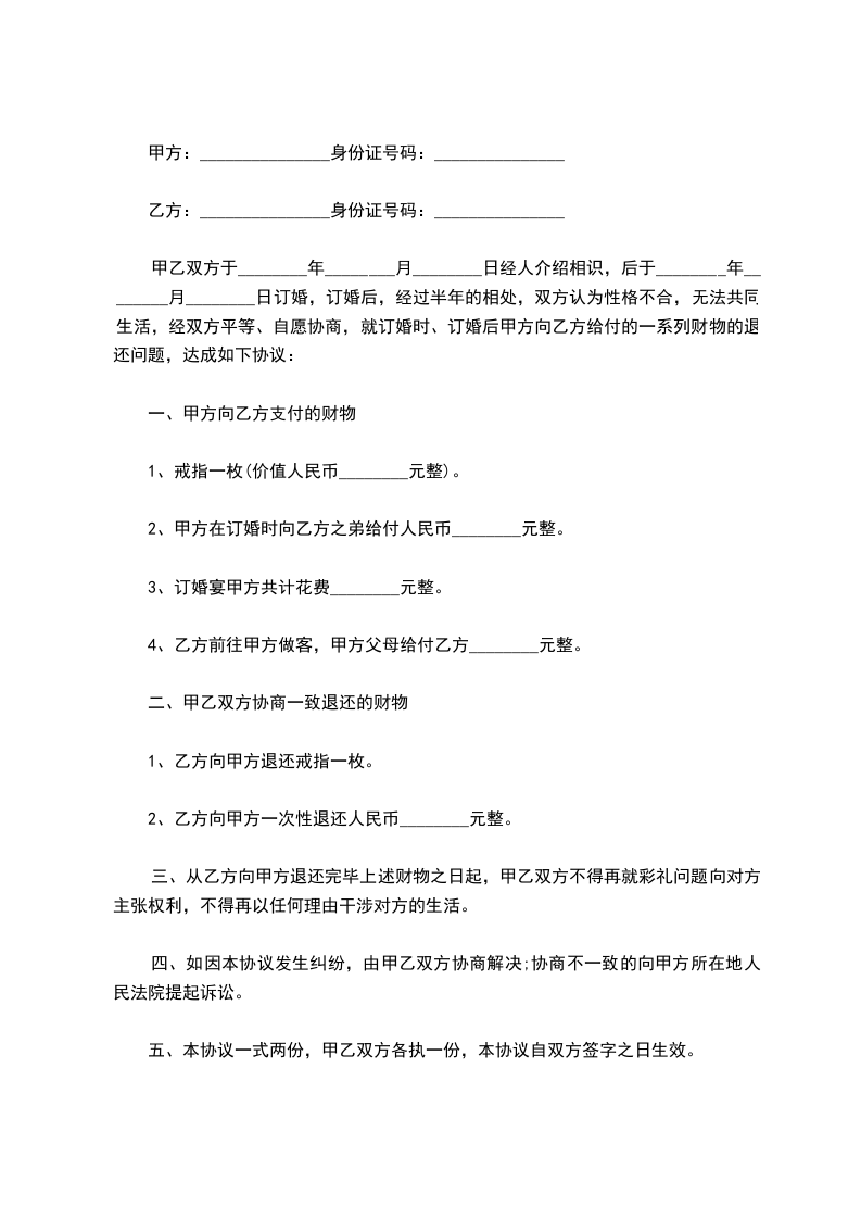 鉴于甲乙双方曾存在婚约关系,现双方就彩礼退还事宜,经友好协商,达成如下协议: