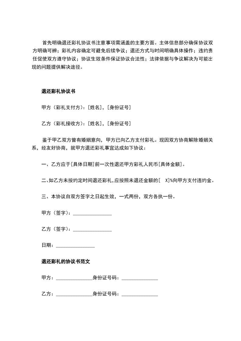 鉴于甲乙双方曾就婚姻相关事宜涉及彩礼给付,现双方经友好协商,就彩礼退款事宜达成如下协议: