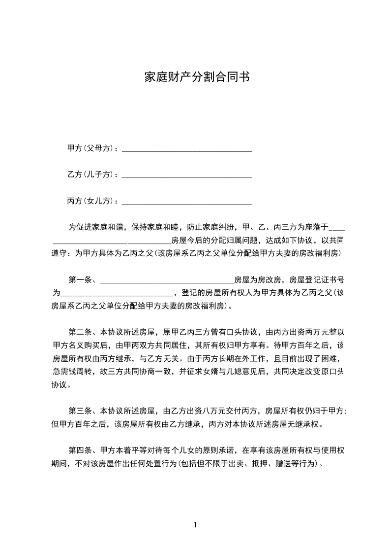 鉴于家庭成员之间就家庭财产分割事宜达成一致意见,经友好协商,特签订本家庭财产分割协议书(以下简称“本协议”),以资共同遵守。