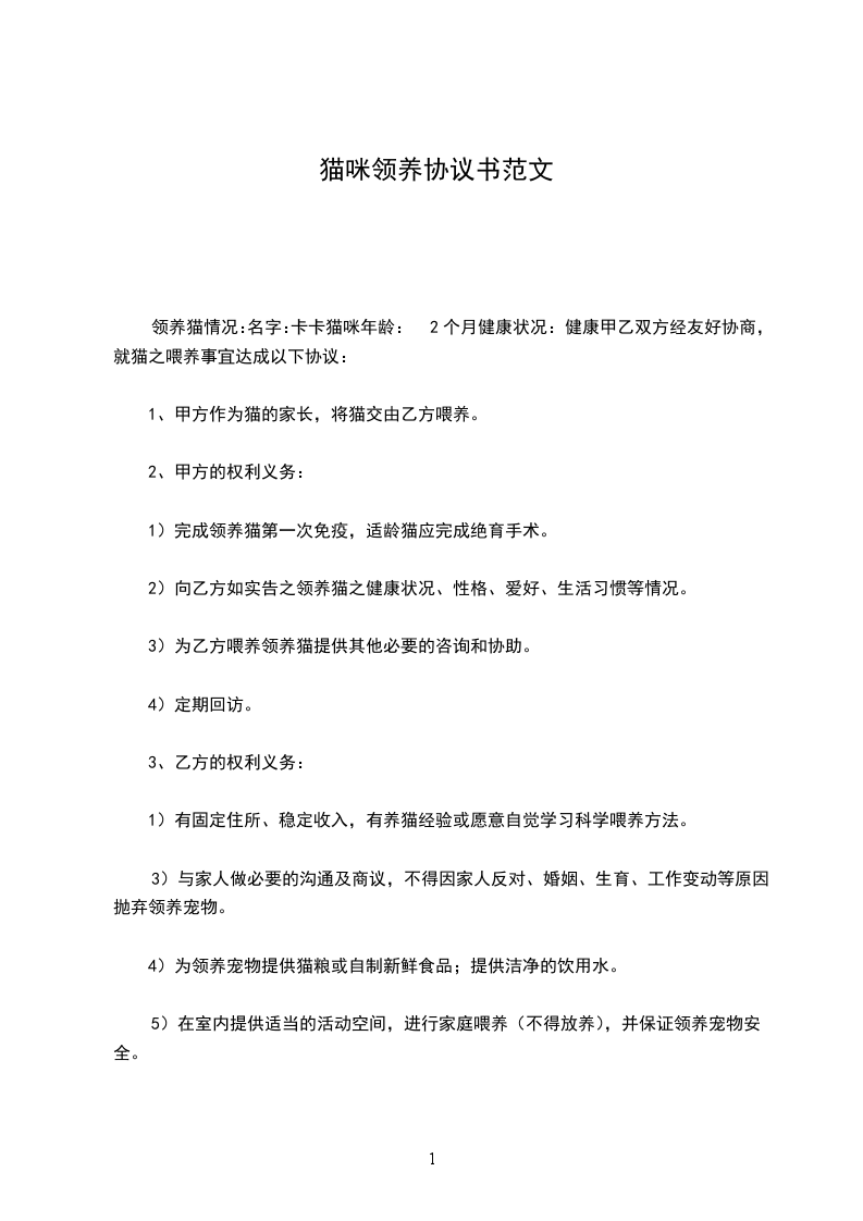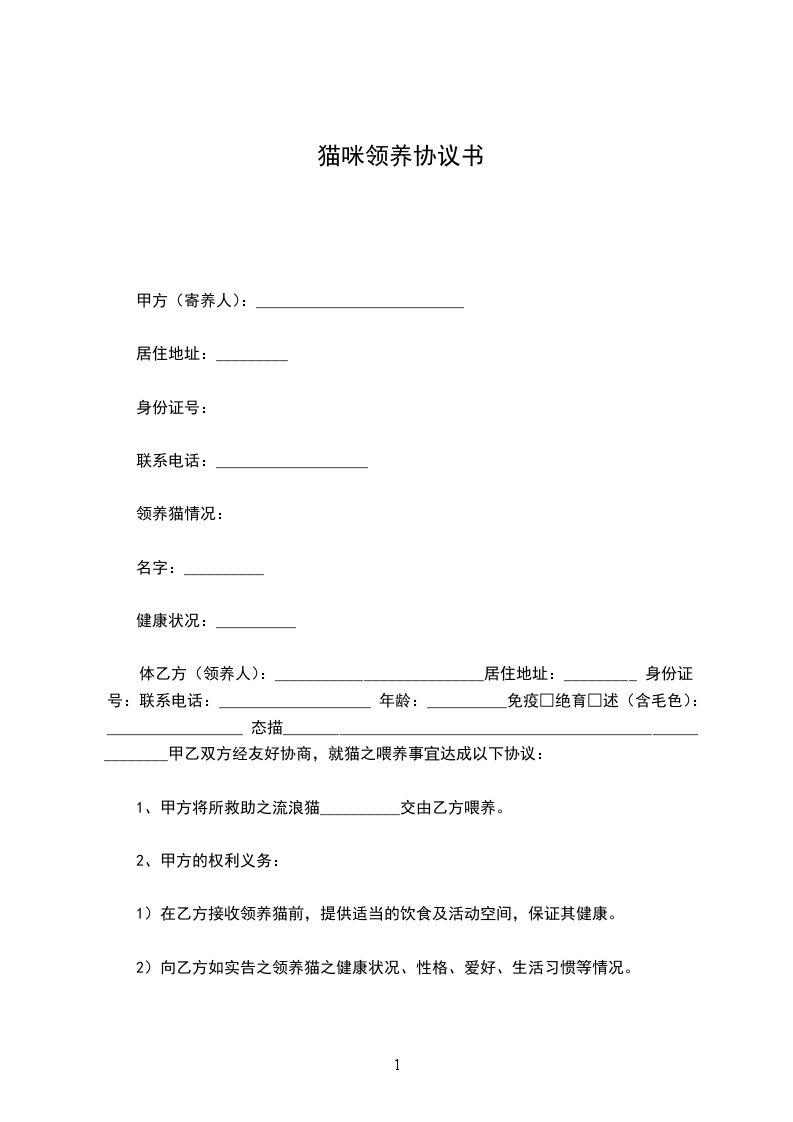 1. 甲方应提供适宜猫咪生活的环境,保证猫咪的饮食、住宿、医疗等条件。