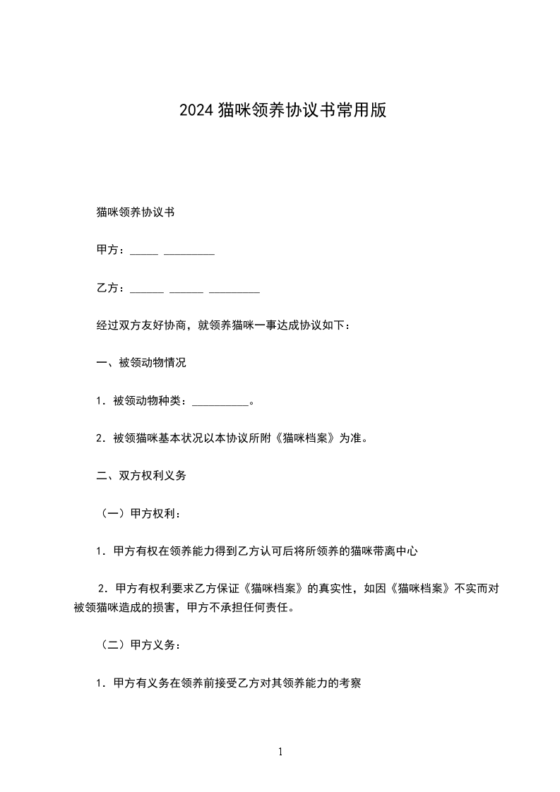 1. 甲方有权按照本协议约定领养流浪猫,并享有对其的饲养、照顾等权利。