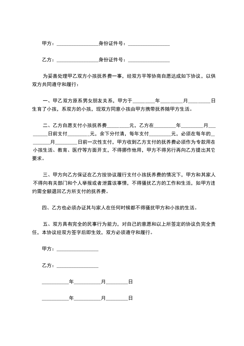 三、甲方向乙方保证在乙方按协议履行支付小孩抚养费的情况下,甲方和其家人不得向有关部门和个人举报或者泄露该事情,不得骚扰乙方的工作和生活,如甲方违约需全额退回乙方所支付的抚养费。