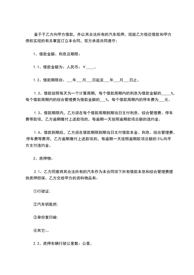 1. 乙方提供的抵押车辆品牌为______,型号为______,颜色为______,车牌号为______。