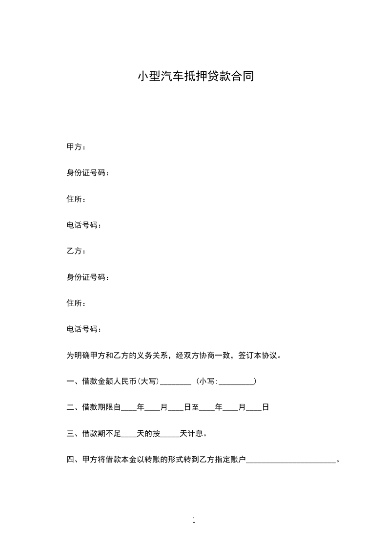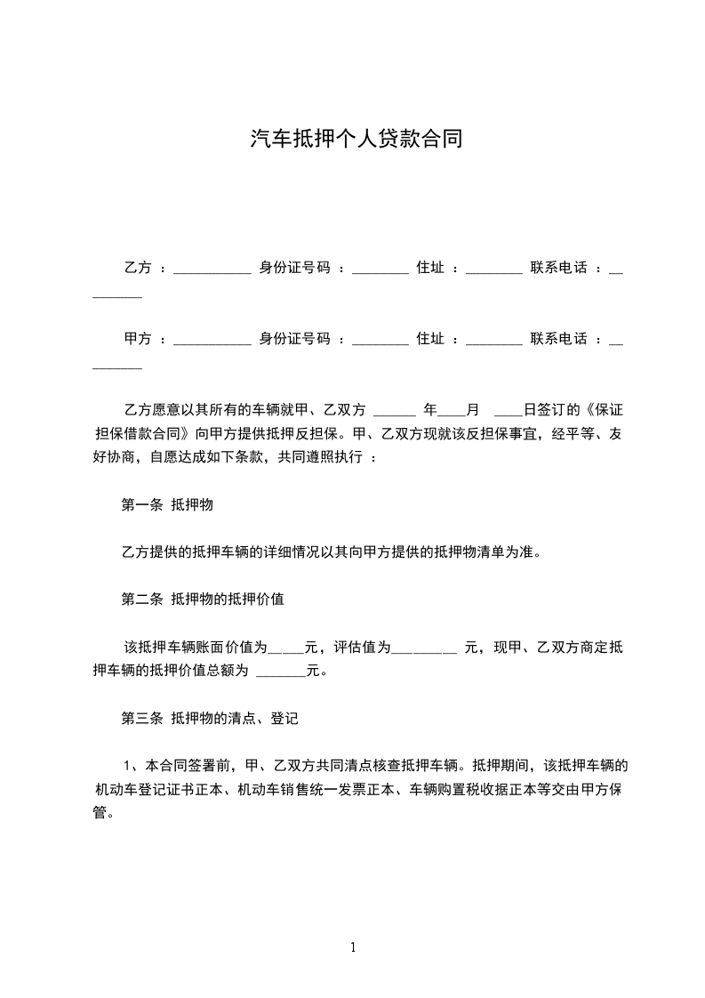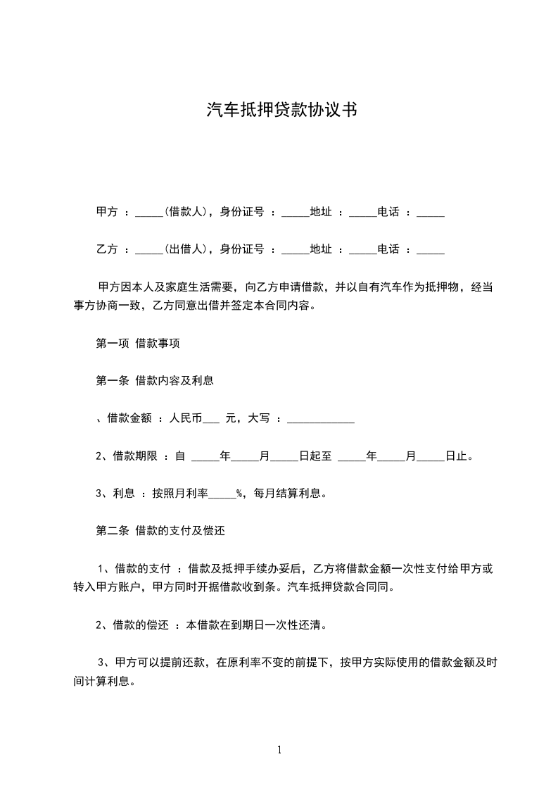 篇1汽车抵押贷款协议