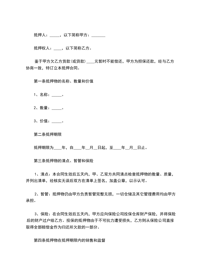 1. 抵押物由______方负责保管,在抵押期间,乙方应妥善保管抵押物,保持抵押物的完好无损。未经甲方书面同意,乙方不得擅自转让、出租、赠与、抵押抵押物或对抵押物进行其他处置。