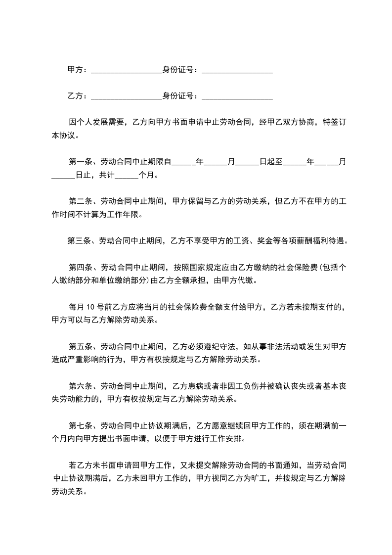 第七条、劳动合同中止协议期满后,乙方愿意继续回甲方工作的,须在期满前一个月内向甲方提出书面申请,以便于甲方进行工作安排。