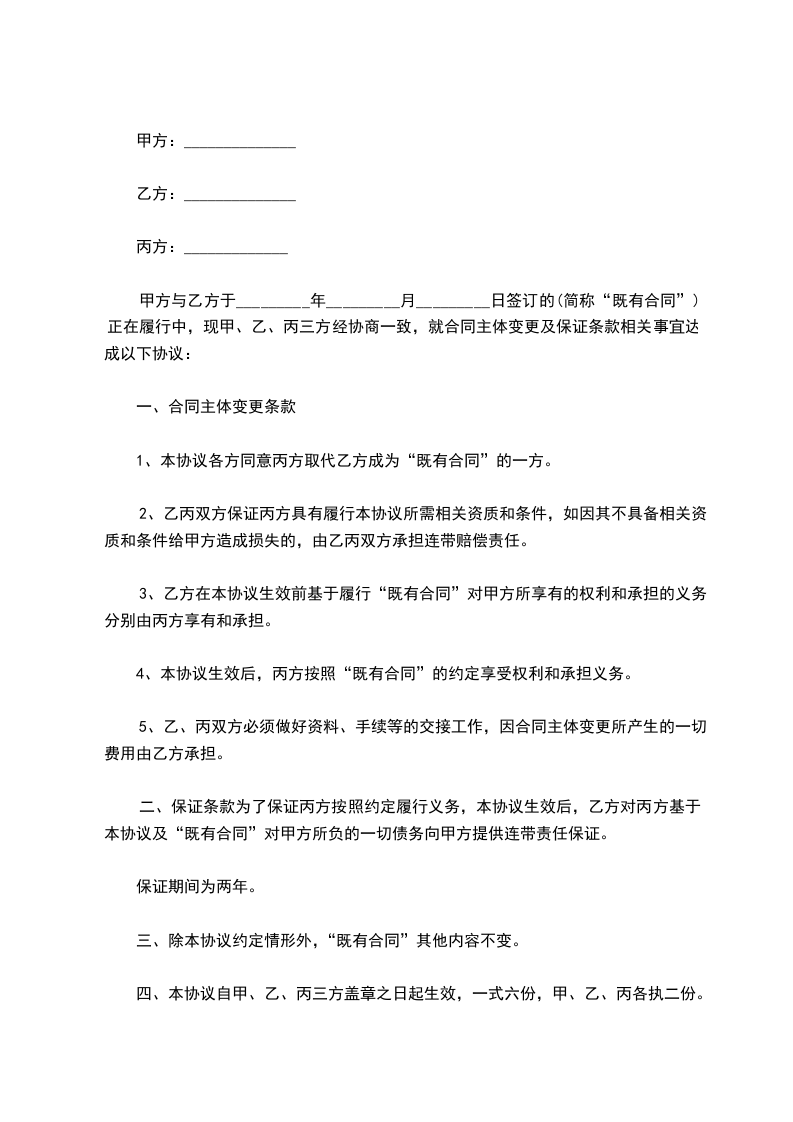 年_________月_________日签订的(简称“既有合同”)正在履行中,现甲、乙、丙三方经协商一致,就合同主体变更及保证条款相关事宜达成以下协议: