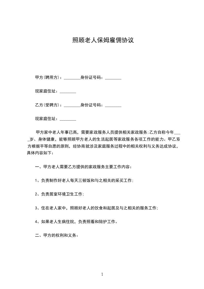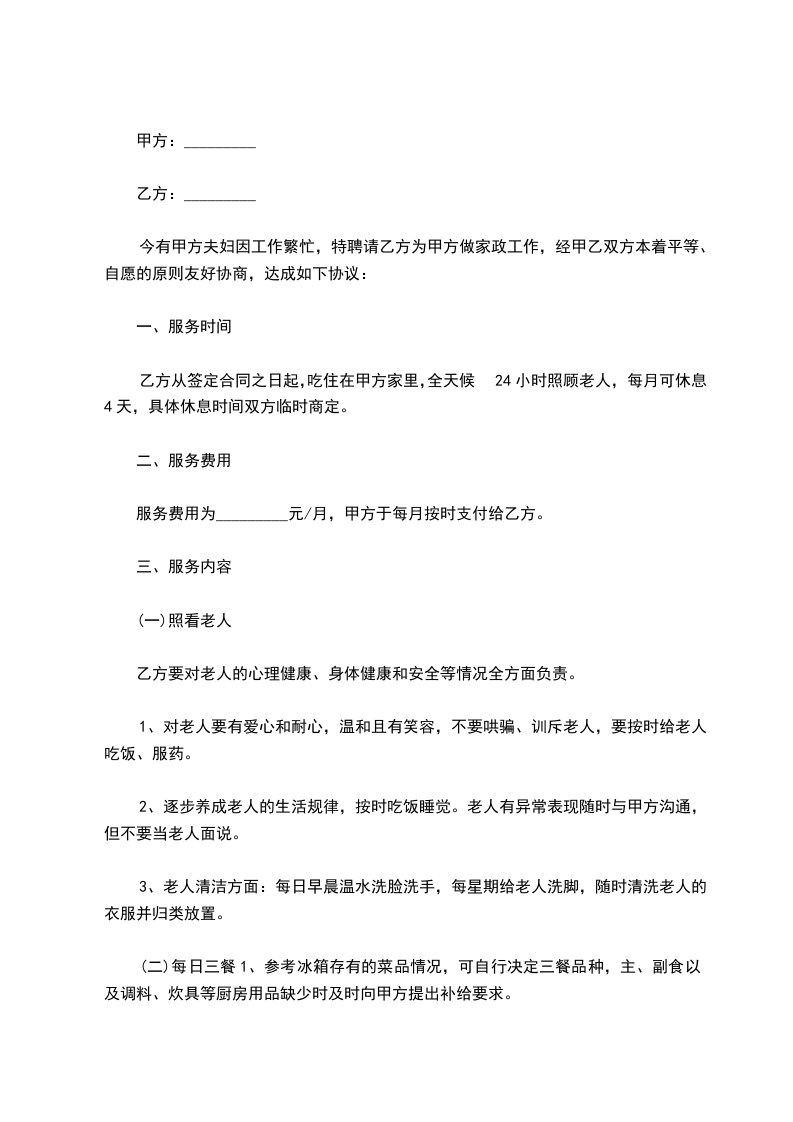 1. 乙方负责照顾甲方家中[老人姓名]的日常生活起居,包括但不限于协助老人洗漱、穿衣、用餐、如厕、翻身、清洁身体等。