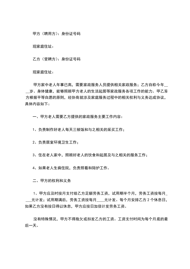 根据《中华人民共和国民法典》及相关法律法规的规定,甲乙双方在平等、自愿、公平、诚实信用的基础上,就乙方为甲方提供家庭照顾老人服务事宜,达成如下协议: