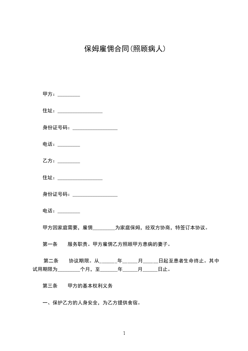 1. 乙方负责照顾甲方家中[老人姓名]的日常生活起居,包括但不限于协助老人进食、洗漱、穿衣、如厕、移动等。