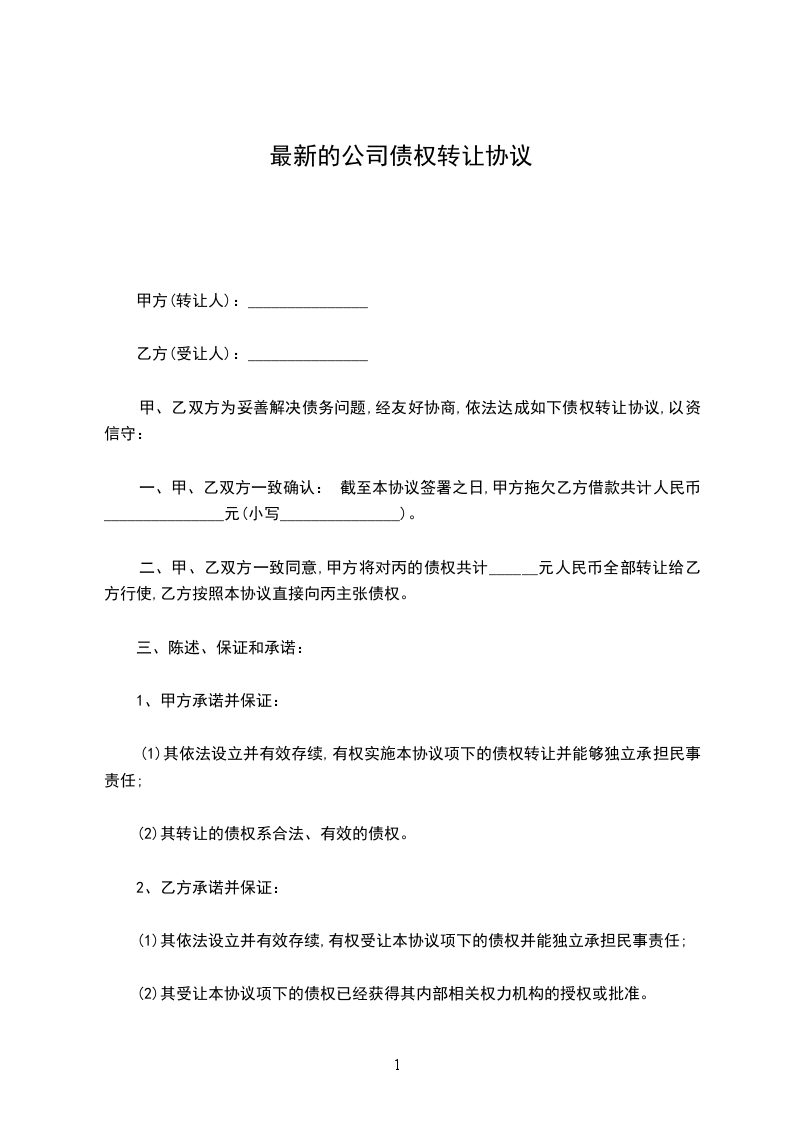 二、甲、乙双方一致同意,甲方将对____________的债权共计_________________元人民币全部转让给乙方行使,乙方按照本协议直接向____________主张债权。