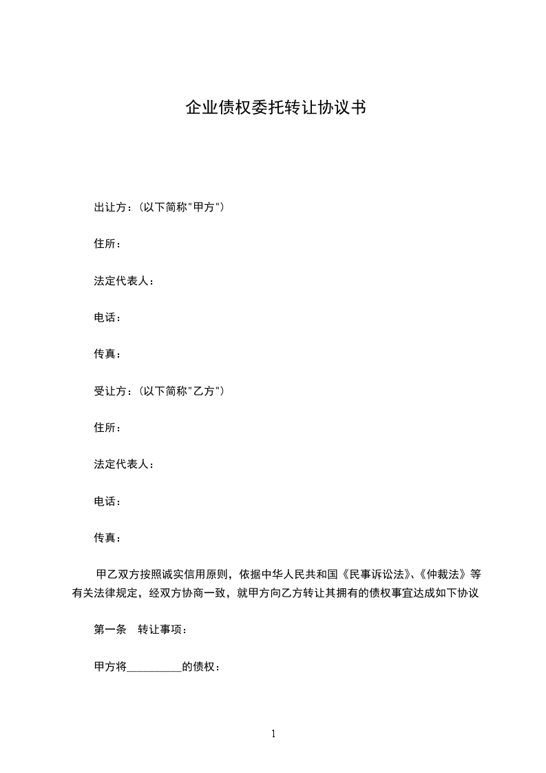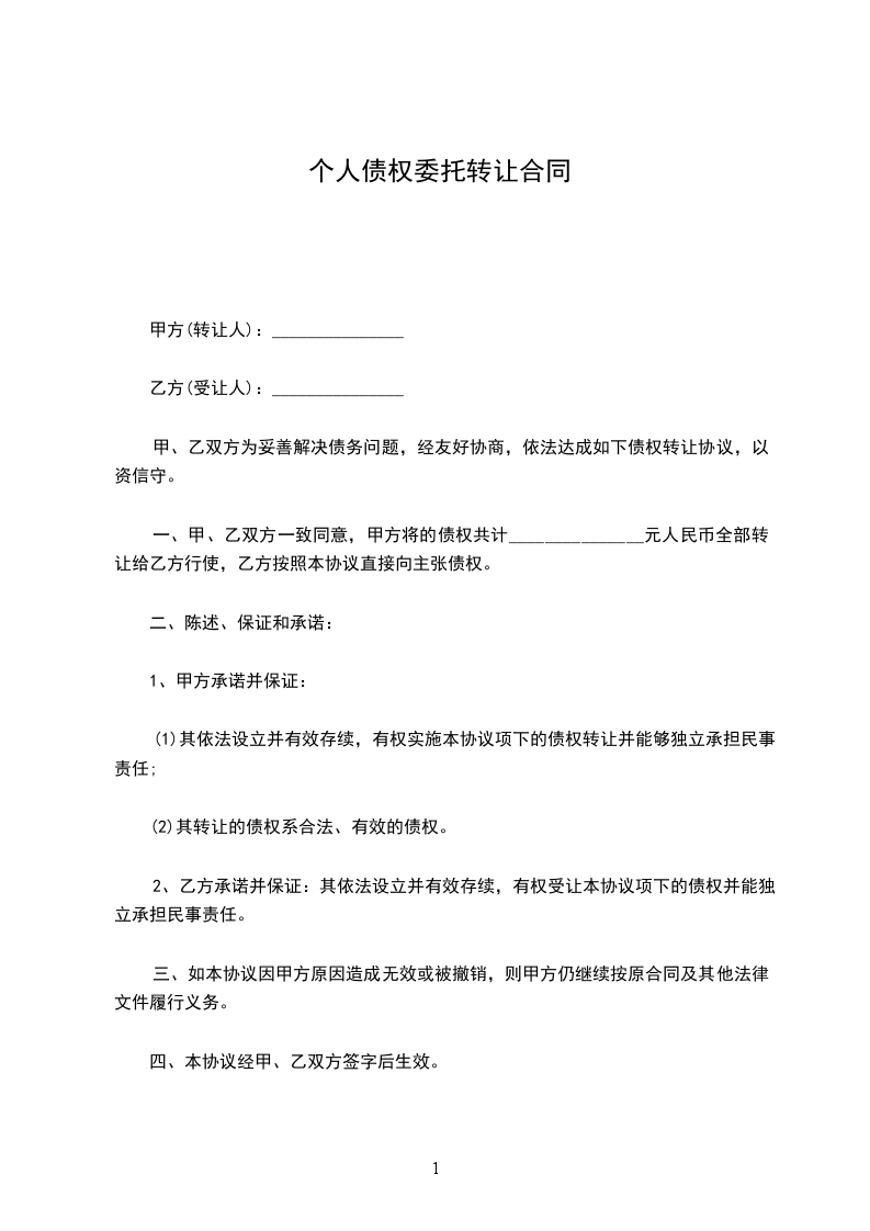 一、甲、乙双方一致同意,甲方将的债权共计_______________元人民币全部转让给乙方行使,乙方按照本协议直接向主张债权。