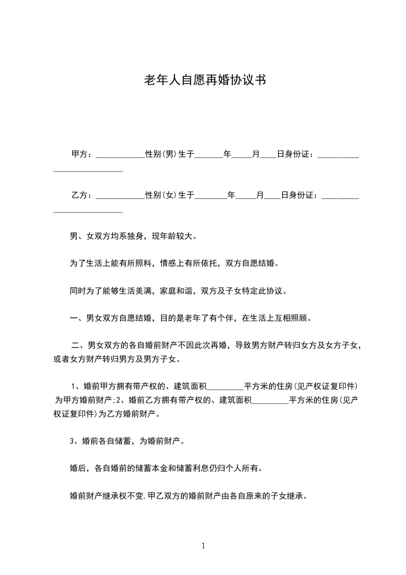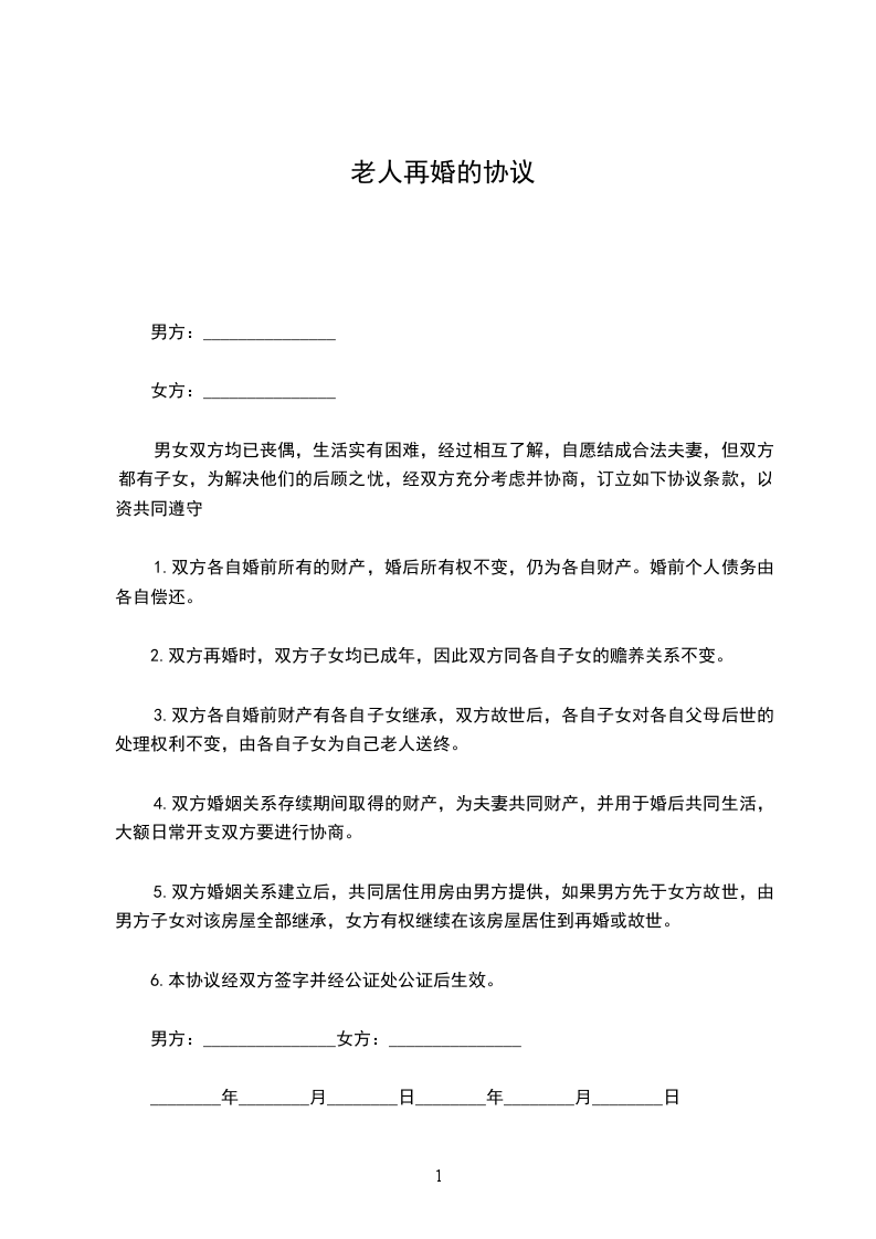 一、男女双方自愿结婚,目的是老年了有个伴,在生活上互相照顾。