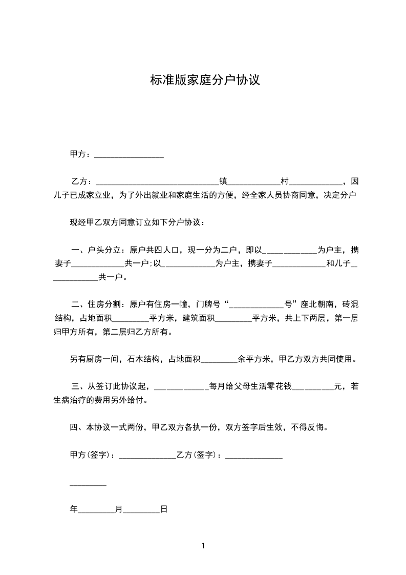 乙方:______________________________镇_____________村_____________,因儿子已成家立业,为了外出就业和家庭生活的方便,经全家人员协商同意,决定分户。