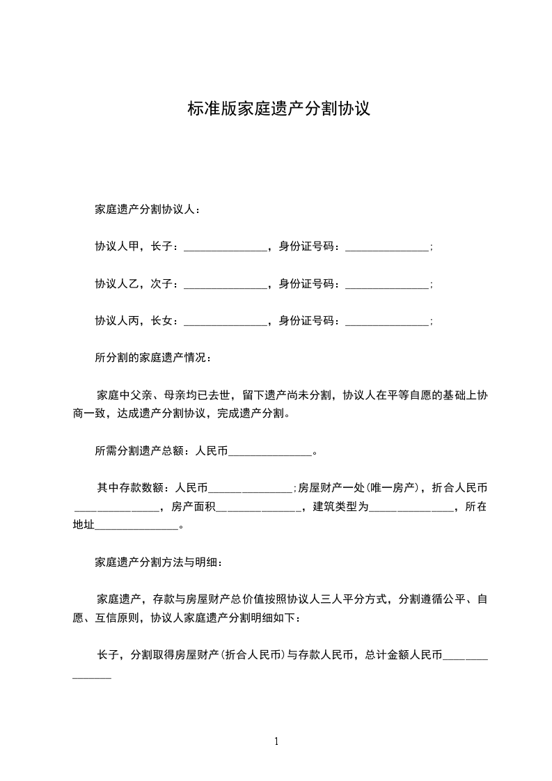 二、住房分割:原户有住房一幢,门牌号“_____________号”座北朝南,砖混结构,占地面积_________平方米,建筑面积_________平方米,共上下两层,第一层归甲方所有,第二层归乙方所有。