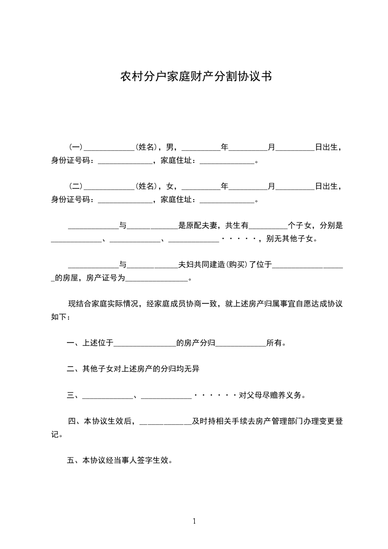 一、户头分立:原户共四人口,现一分为二户,即以_____________为户主,携妻子_____________共一户;以_____________为户主,携妻子_____________和儿子_____________共一户。