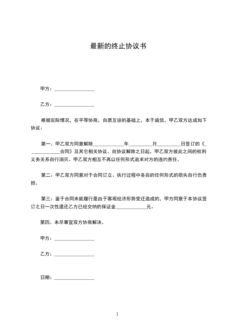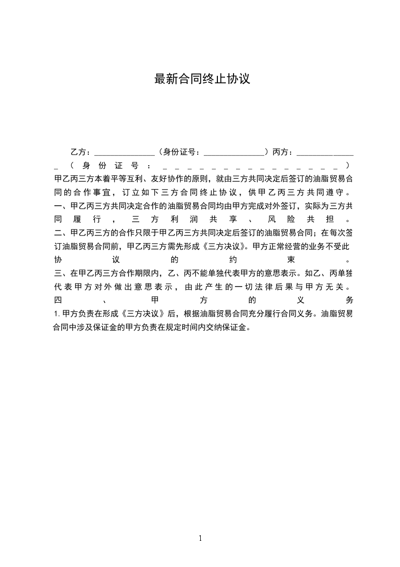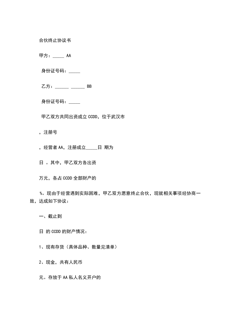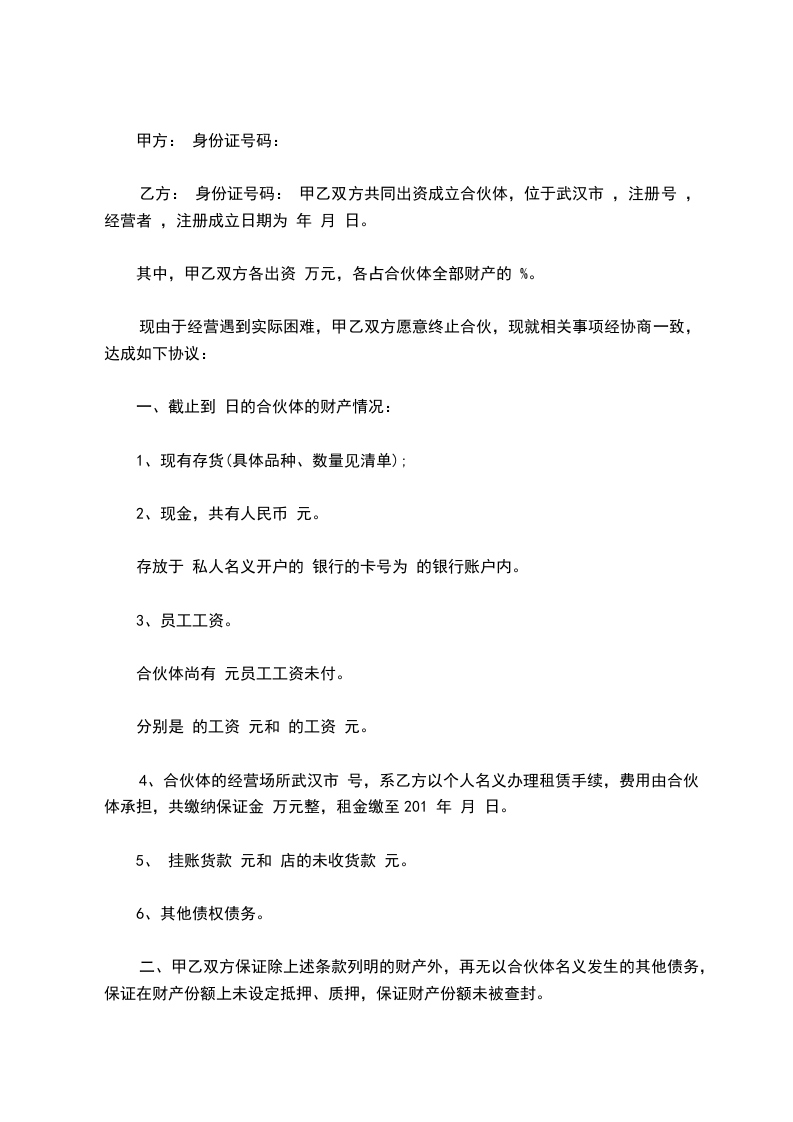 现由于经营遇到实际困难,甲乙双方愿意终止合伙,现就相关事项经协商一致,达成如下协议: