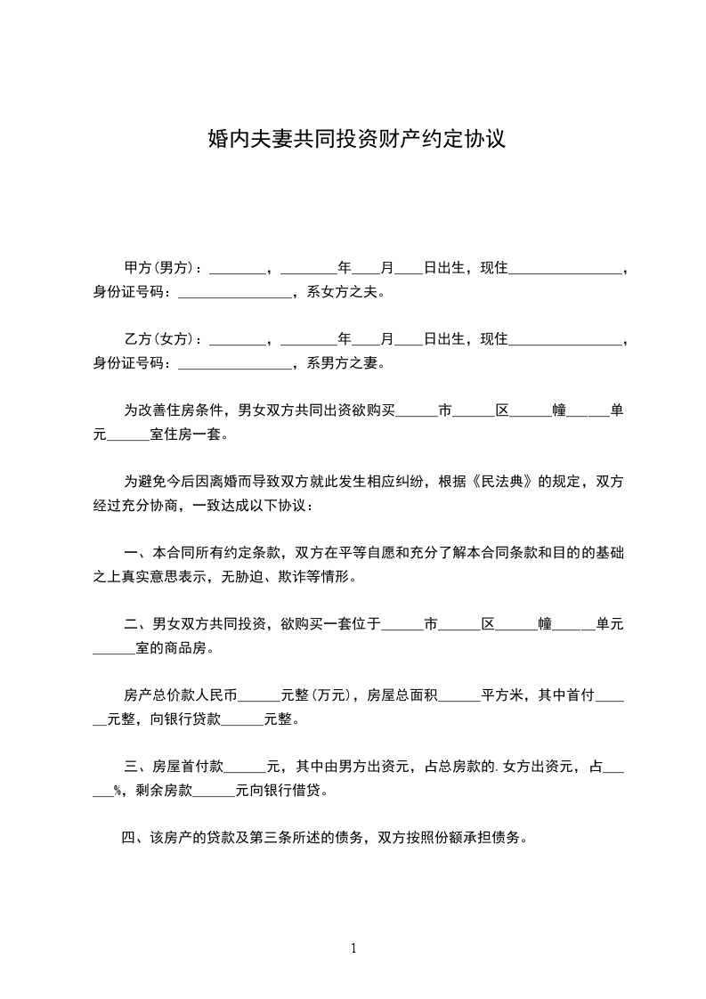 二、男女双方共同投资,欲购买一套位于______市______区______幢______单元______室的商品房。