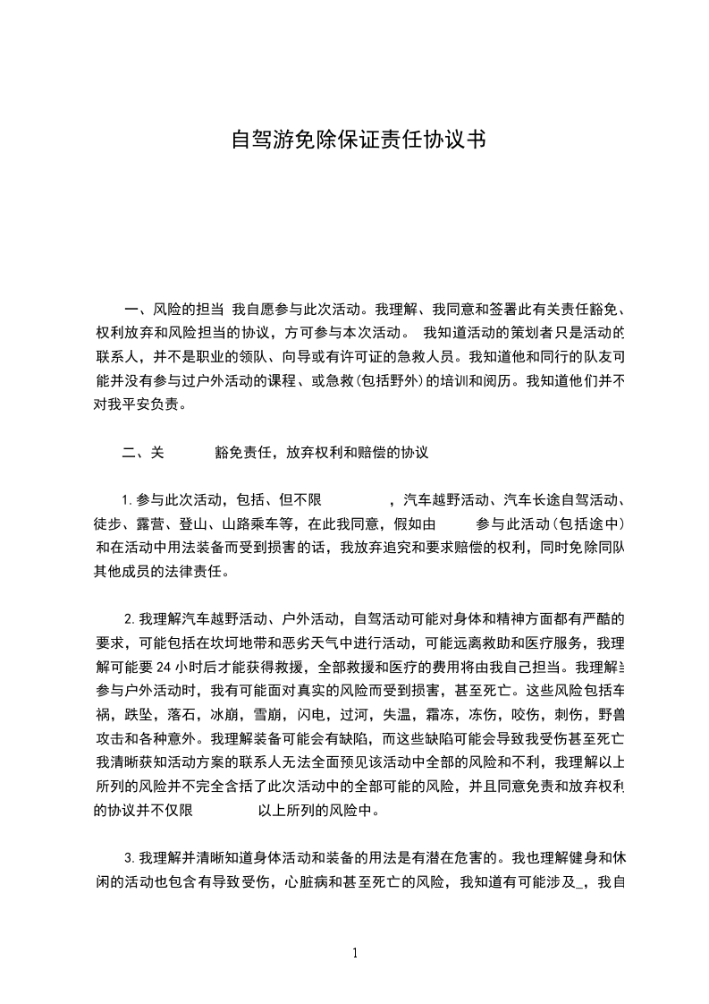 1. 乙方自愿搭乘甲方自驾车辆,已知悉并充分理解自驾出行存在一定风险,包括但不限于交通事故、车辆故障、自然灾害等。乙方明确表示自行承担因搭乘车辆可能产生的一切风险和后果,与甲方无关。