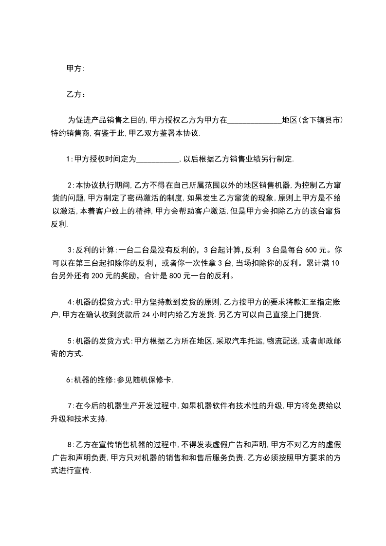 8:乙方在宣传销售机器的过程中,不得发表虚假广告和声明,甲方不对乙方的虚假广告和声明负责,甲方只对机器的销售和和售后服务负责.乙方必须按照甲方要求的方式进行宣传.