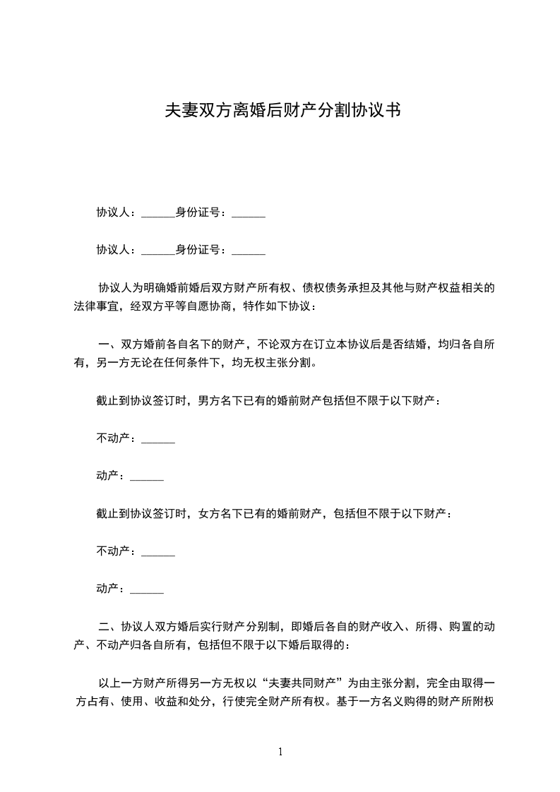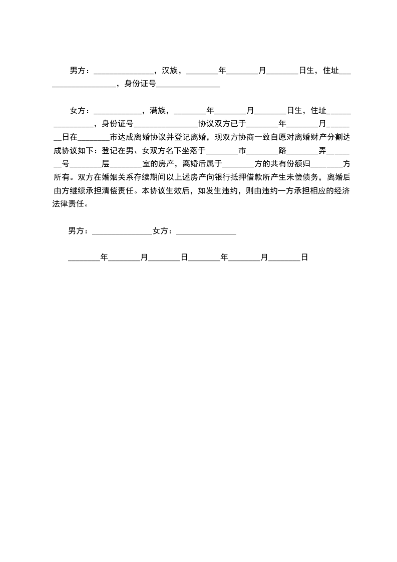 2、债务:女方于______年______月向____________银行借款______万元,借款账号为____________。离婚后,该债务由女方独立承担。男方不承担以上银行债务。