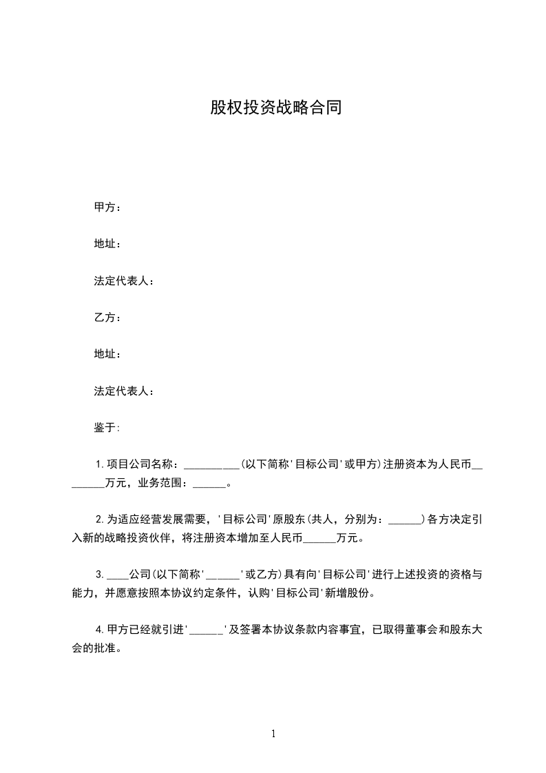 鉴于乙方在[行业领域]具有良好的发展前景和市场潜力,甲方基于对乙方的战略评估与投资意向,双方经友好协商,依据《中华人民共和国民法典》等相关法律法规,就甲方战略投资入股乙方事宜达成如下协议: