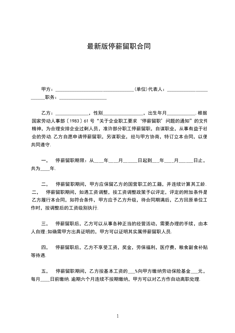 乙方:______________,性别_________________,出生年月____________.根据国家劳动人事部〔1983〕61号“关于企业职工要求‘停薪留职’问题的通知”的文件精神,为合理安排企业过剩人员,准许部分职工停薪留职,自谋职业,从事有益于社会的劳动.乙方自愿申请停薪留职,另谋职业,经与甲方协商,特订立本合同,以便共同遵守.