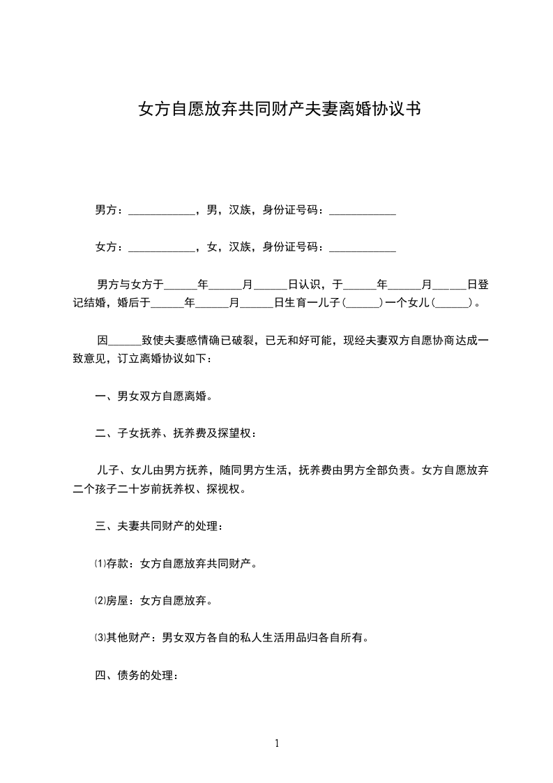 1. 经双方协商一致,自本协议生效之日起,夫妻共同财产中明确属于女方名下的财产,归女方个人所有,男方不再享有任何权益。