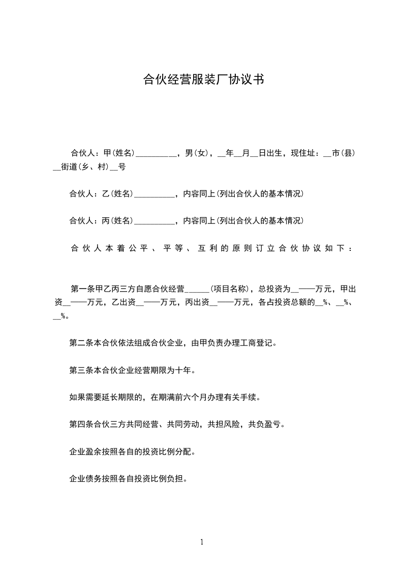 合伙人本着公平、平等、互利的原则订立合伙协议如下: