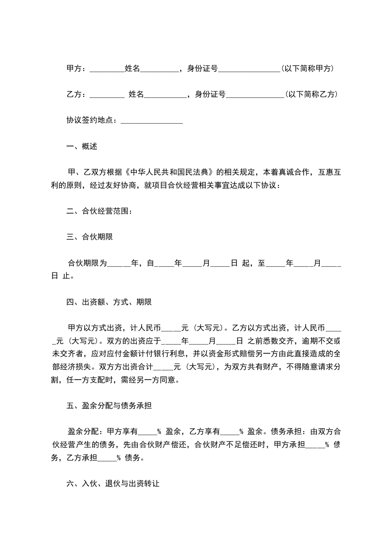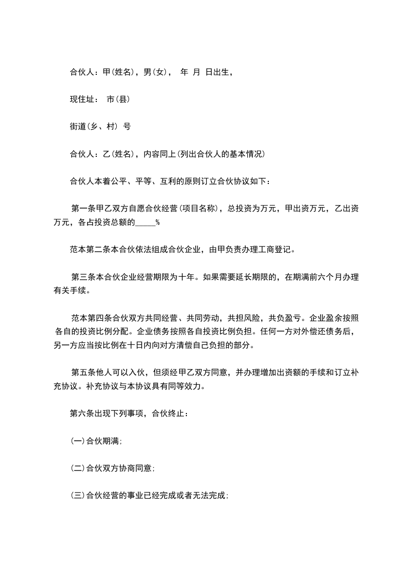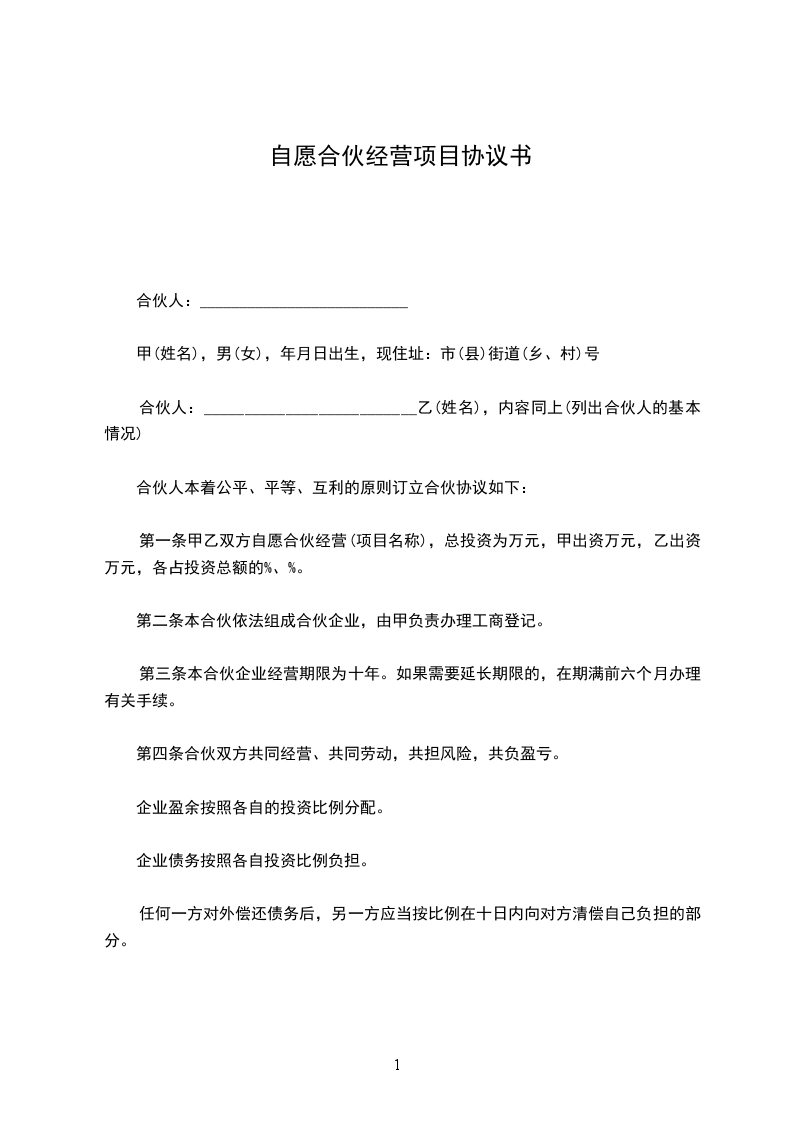 第一条甲乙双方自愿合伙经营(项目名称),总投资为万元,甲出资万元,乙出资万元,各占投资总额的_____%、%。