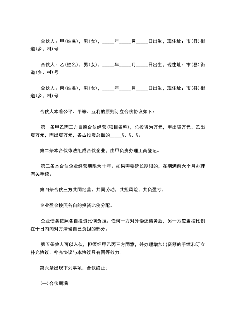 合伙人本着公平、平等、互利的原则订立合伙协议如下: