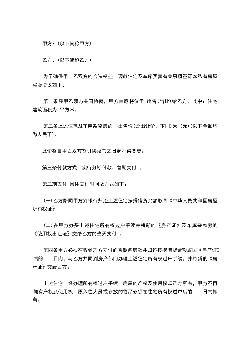 为了确保甲、乙双方的合法权益,现就住宅及车库买卖有关事项签订本私有房屋买卖协议如下: