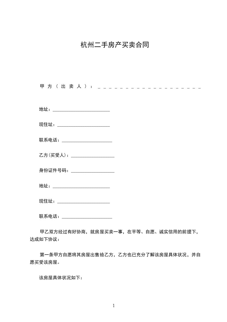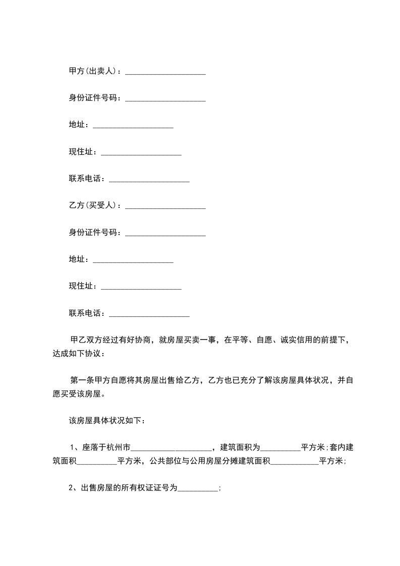1、座落于杭州市____________________,建筑面积为__________平方米;套内建筑面积__________平方米,公共部位与公用房屋分摊建筑面积____________平方米;