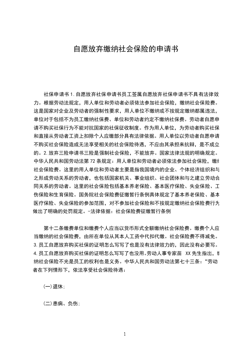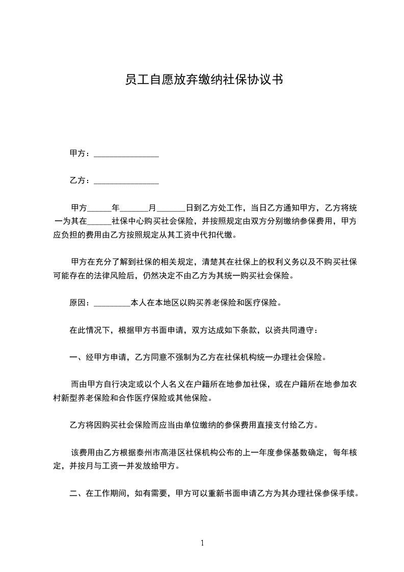 一、经甲方申请,乙方同意不强制为乙方在社保机构统一办理社会保险。