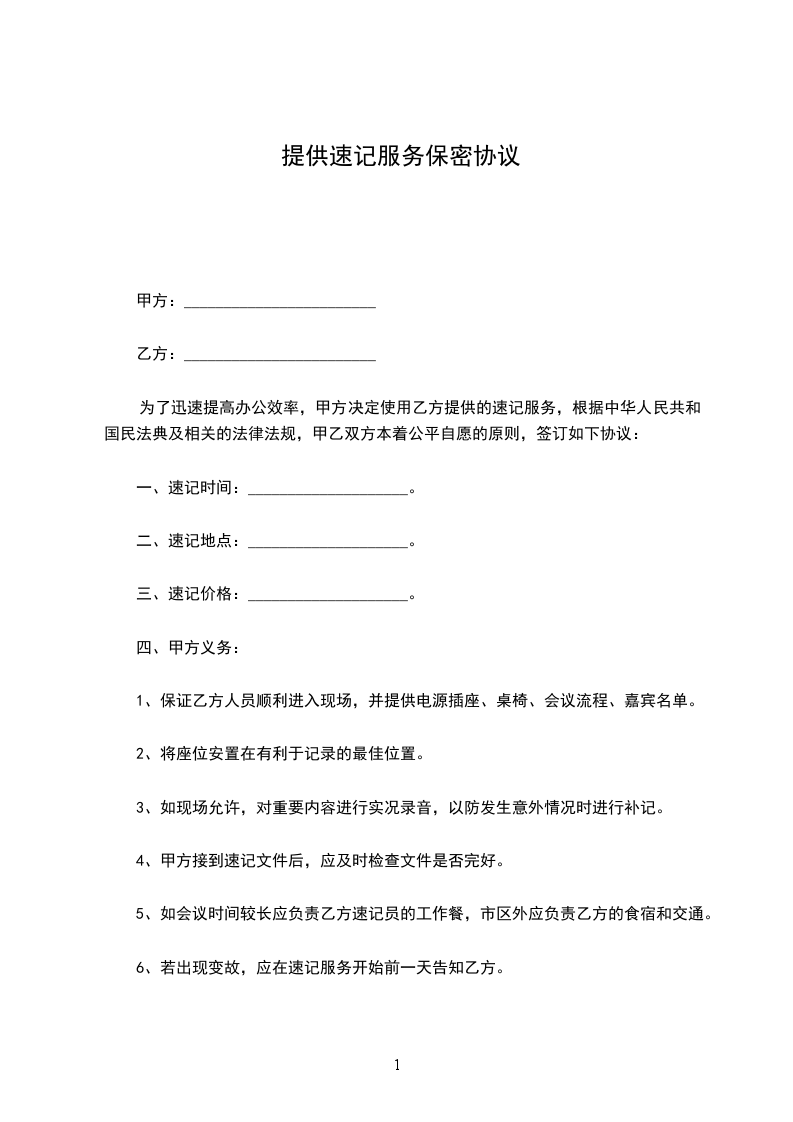 为了迅速提高办公效率,甲方决定使用乙方提供的速记服务,根据中华人民共和国民法典及相关的法律法规,甲乙双方本着公平自愿的原则,签订如下协议: