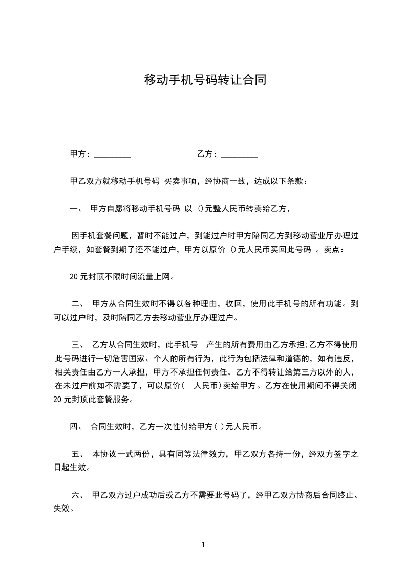 1. 转让价格:乙方应向甲方支付人民币[X]元作为手机号码转让费用。