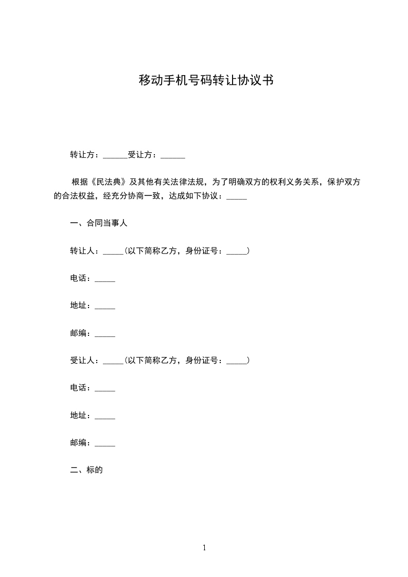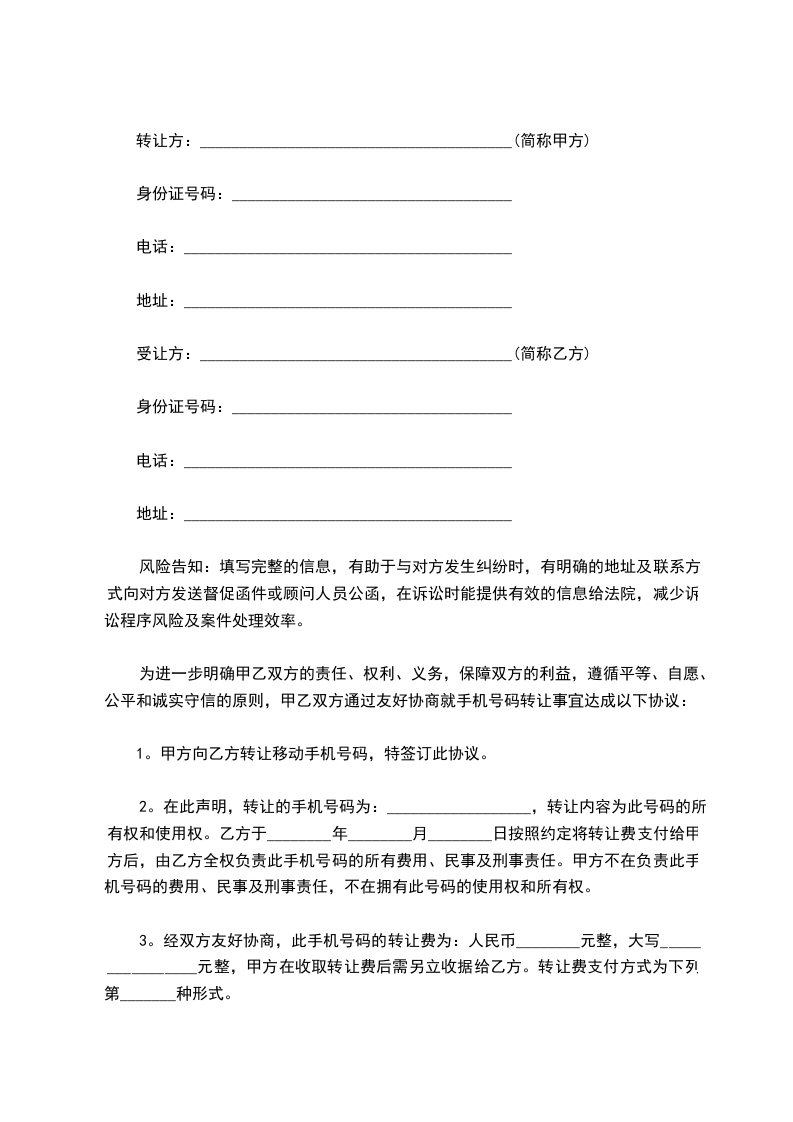 鉴于甲方拥有[手机号码]的使用权,现甲方拟将该手机号码转让给乙方,双方经友好协商,达成如下协议: