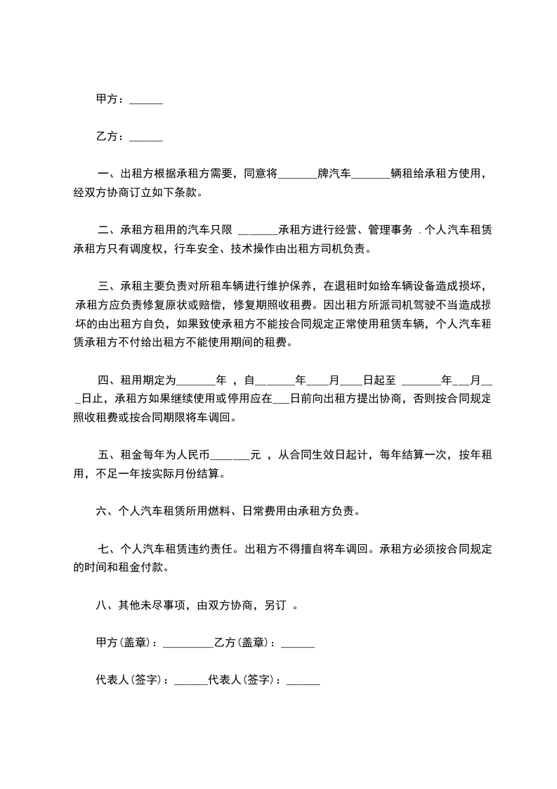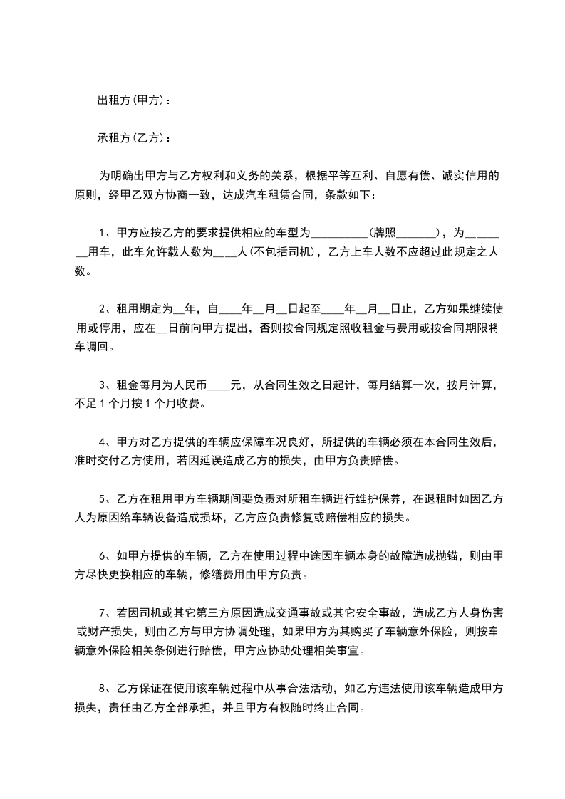 一、出租方根据承租方需要,同意将____牌汽车____辆租给承租方使用,经双方协商订立如下条款。