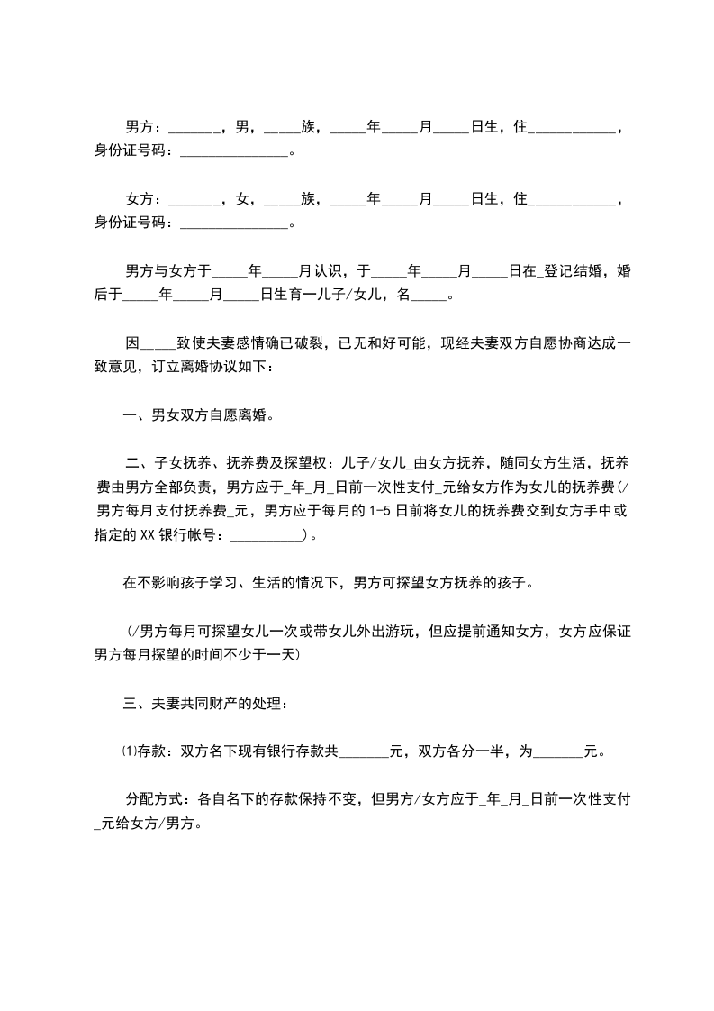 二、子女抚养、抚养费及探望权:儿子/女儿_由女方抚养,随同女方生活,抚养费由男方全部负责,男方应于_年_月_日前一次性支付_元给女方作为女儿的抚养费(/男方每月支付抚养费_元,男方应于每月的1-5日前将女儿的抚养费交到女方手中或指定的XX银行帐号:__________)。