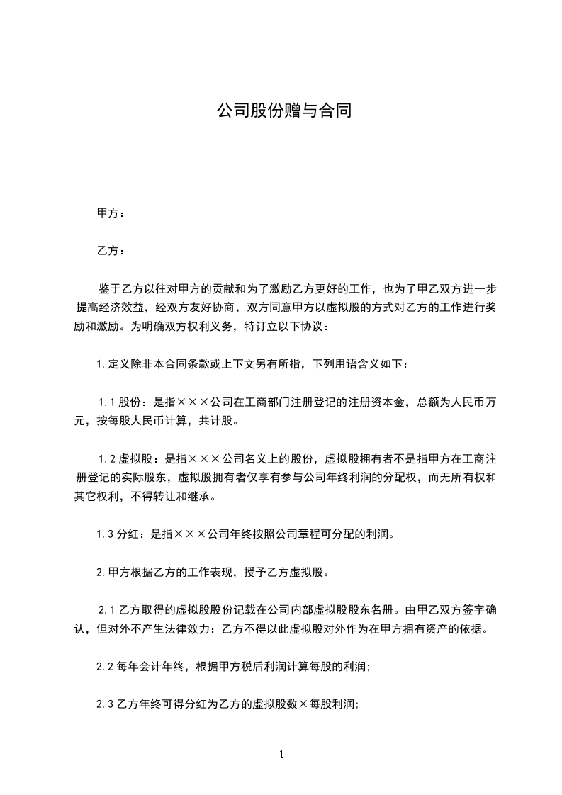 1.2虚拟股:是指×××公司名义上的股份,虚拟股拥有者不是指甲方在工商注册登记的实际股东,虚拟股拥有者仅享有参与公司年终利润的分配权,而无所有权和其它权利,不得转让和继承。
