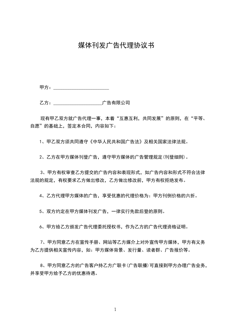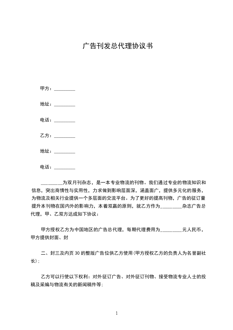 _________为双月刊杂志,是一本专业物流的刊物。我们通过专业的物流知识和信息,突出商情性与实用性,力求做到影响层面深,涵盖面广,提供多元化的服务,为物流及相关行业提供一个多层面的交流平台。为了更好的提高刊物,广告的征订量,提升本刊物在国内外的影响力,本着双赢的原则,就乙方作为_________杂志广告总代理,甲、乙双方达成如下协议: