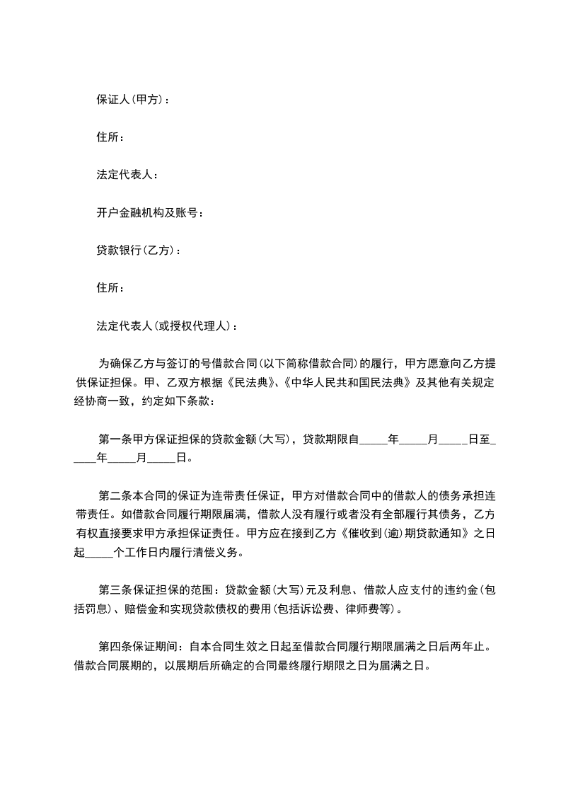 第一条甲方保证担保的贷款金额(大写),贷款期限自_____年_____月_____日至_____年_____月_____日。