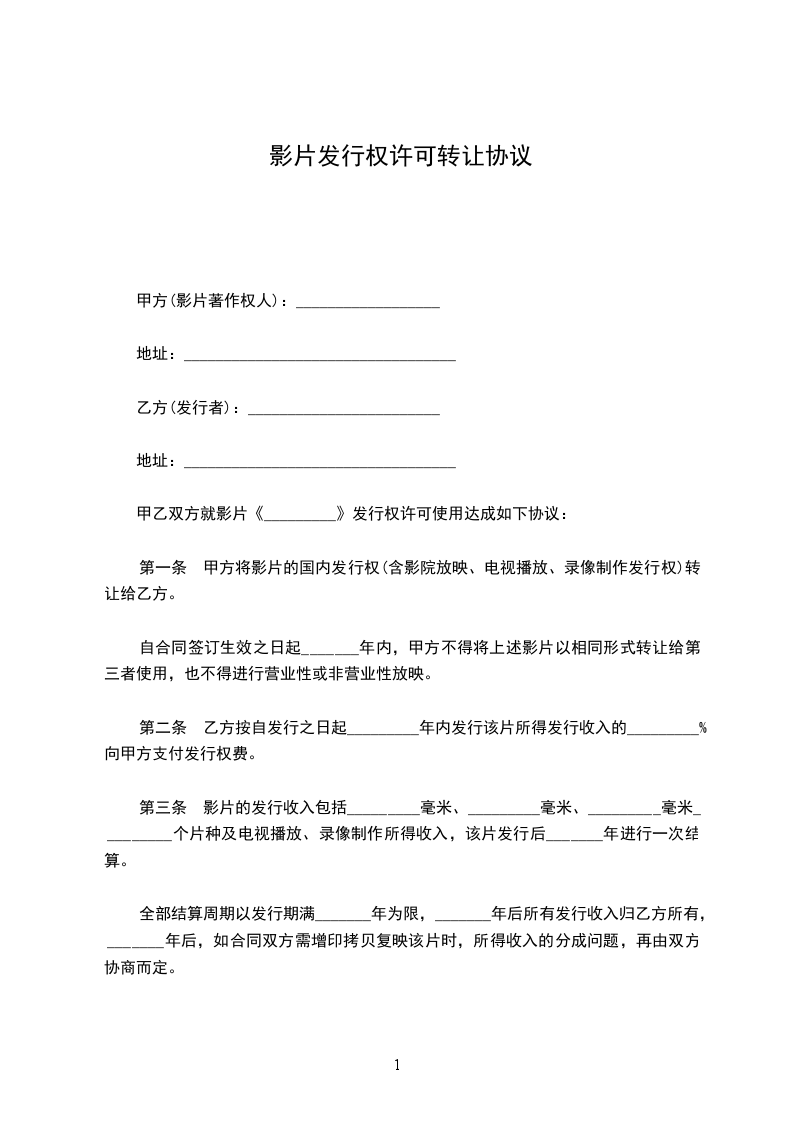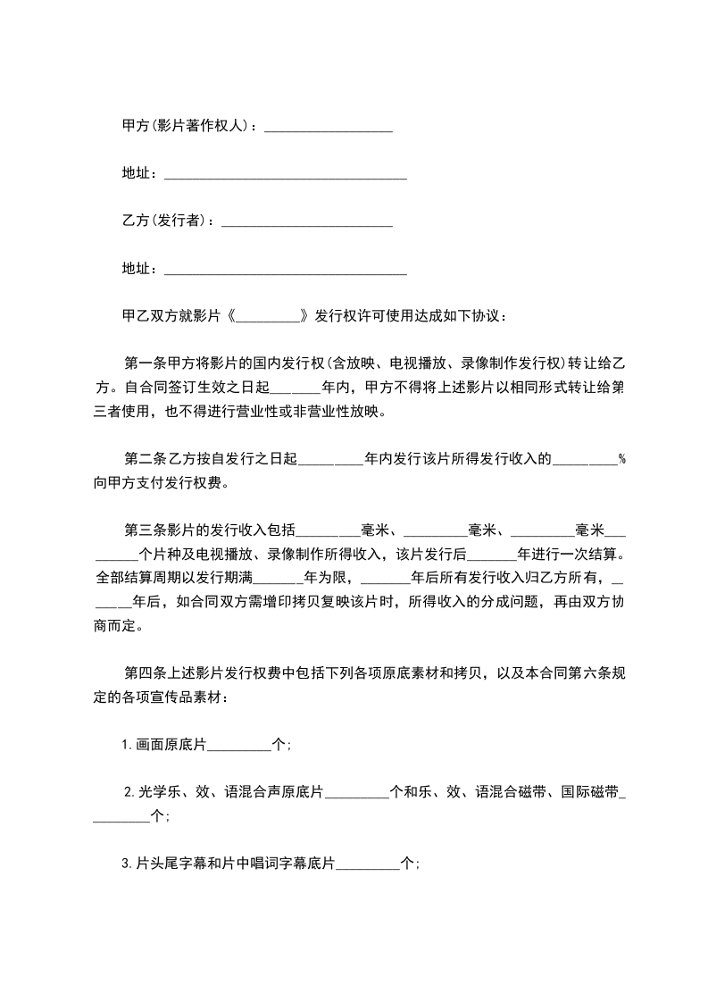 第一条 甲方将影片的国内发行权(含影院放映、电视播放、录像制作发行权)转让给乙方。自合同签订生效之日起_______年内,甲方不得将上述影片以相同形式转让给第三者使用,也不得进行营业性或非营业性放映。