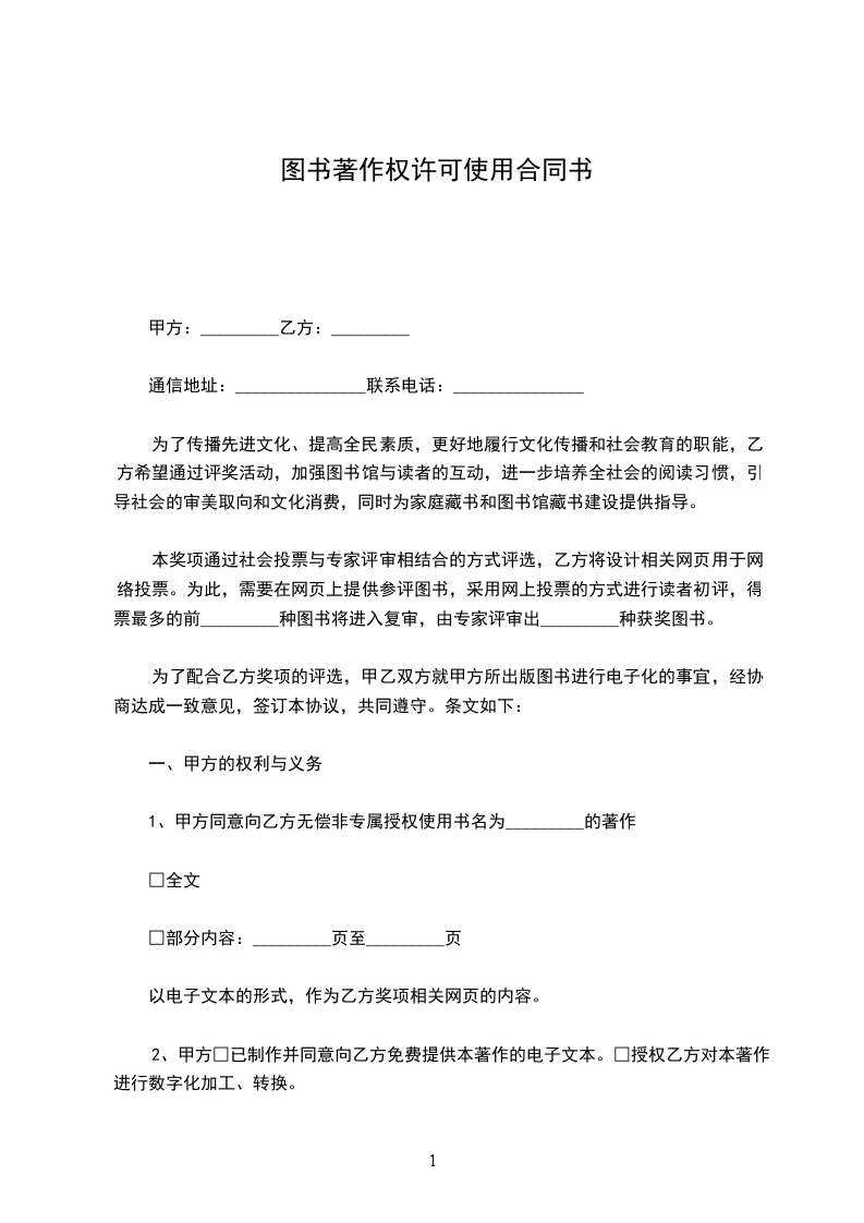 1、甲方同意向乙方无偿非专属授权使用书名为_________的著作(包括该著作的版式及装帧,以下简称本著作)