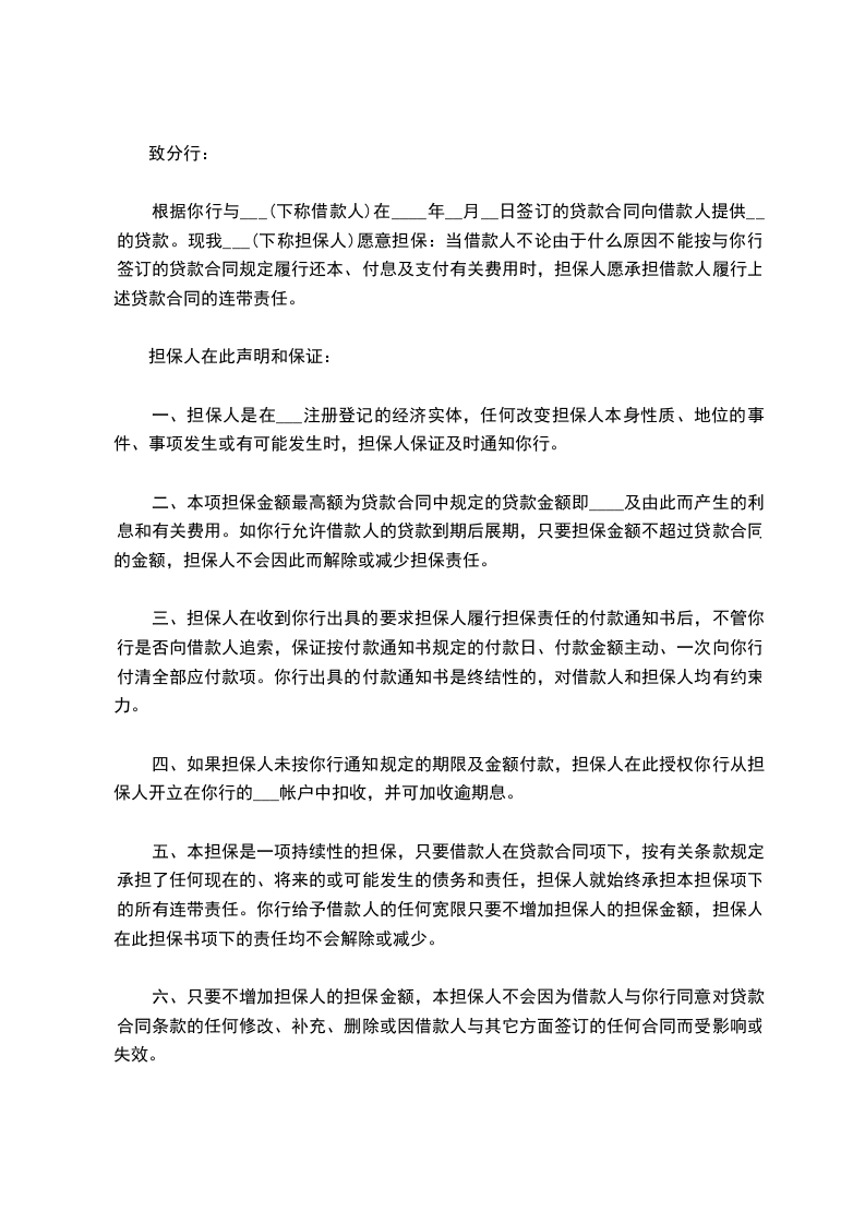 根据你行与___(下称借款人)在____年__月__日签订的贷款合同向借款人提供__的贷款。现我___(下称担保人)愿意担保:当借款人不论由于什么原因不能按与你行签订的贷款合同规定履行还本、付息及支付有关费用时,担保人愿承担借款人履行上述贷款合同的连带责任。