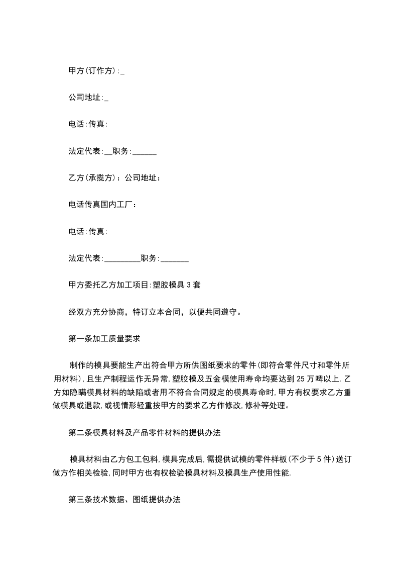 1.所完成的模具所有权应属于甲方,在乙方完成模具并经甲方验收合格后,乙方应将模具送到甲方指定的在长安范围内的某个地点,超出长安范围外的可由甲方支付运输费用,